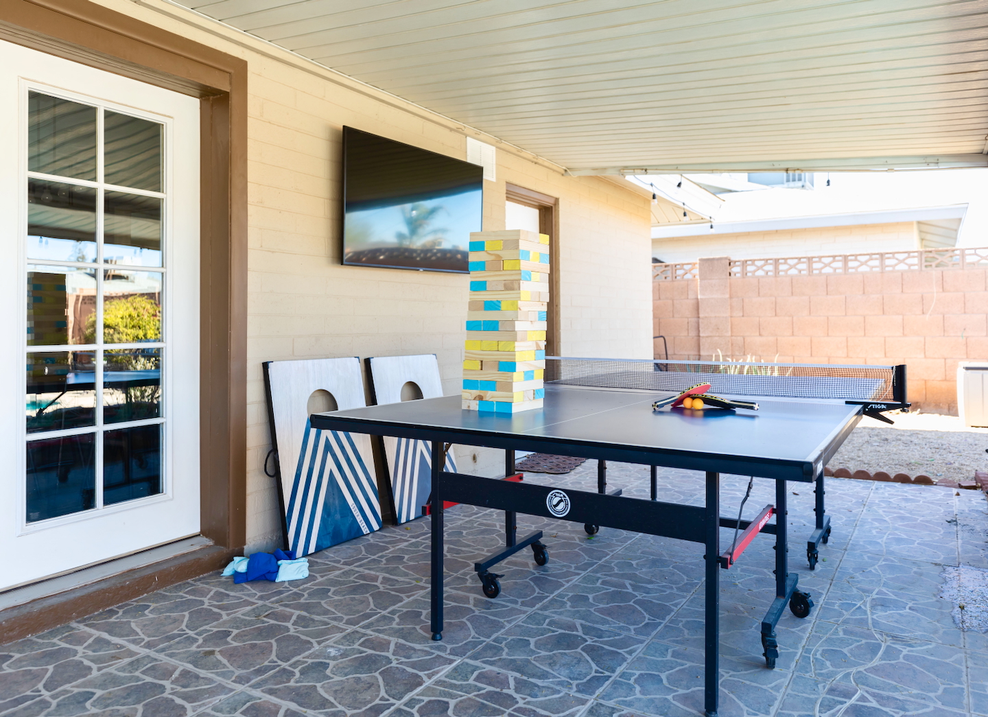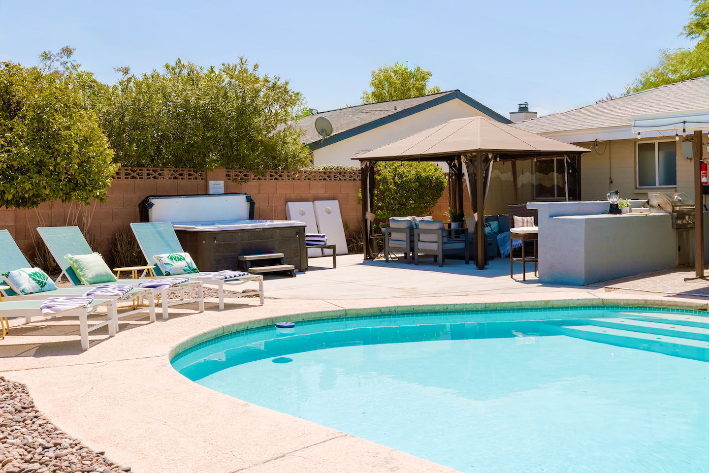 Escape to Desert Jewel, your private desert oasis minutes from Old Town Scottsdale! This fun-filled home has a resort-style backyard with a private heated pool*, hot tub, ping-pong table and fire pit. Inside, enjoy a shuffleboard game and a fully equipped kitchen. Perfect for families and groups seeking sun and relaxation in a prime Scottsdale location. RESORT BACKYARD - Optional heated pool with loungers + umbrella - Hot tub included - Electric air pump for your pool floats + pool towels provided - Covered outdoor lounge with sofa + fire pit - Bar top seating with built-in grill - Ping pong + SmartTV BEDROOMS: -Bedroom 1: King Bed + Private Bathroom w/Shower + 42 inch flat screen smart TV + ceiling fan -Bedroom 2: King Bed + 42 inch flat screen smart TV + ceiling fan -Bedroom 3: Two Queen Beds + 42 inch flat screen smart TV + ceiling fan -Bedroom 4: Twin Over Full Bunk Bed + Twin Bunk Bed BATHROOMS: -Bathroom 1: Walk-in shower + single vanity -Bathroom 2: Walk-in shower, separate tub + single vanity -> Both bathrooms come with hair dryers, fluffy towels, hand soap, body soap, shampoo and conditioner. LIVING ROOM - Large 65 inch flat screen smart TV - Open concept living with living room next to kitchen + dining! - Shuffleboard + Xbox 360 KITCHEN - Stainless steel appliances - Drip coffee maker includes cream/sugar - Locally roasted Press Coffee provided - Teapot, blender, toaster - Pots, pans, baking dishes - Storage containers for leftovers - Mixing bowls, dish towels, knives - Microwave - Filtered water + ice from the refrigerator AMENITIES - Smart TVs: living room, 3 bedrooms, outside w/live TV - High speed internet - Full-size washer + dryer with supplies provided - Iron, ironing board and steamer - Optional concierge service available for fridge stocking, snack boards, marg bar and more.