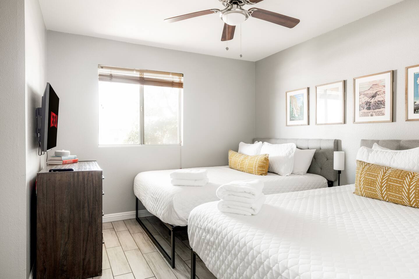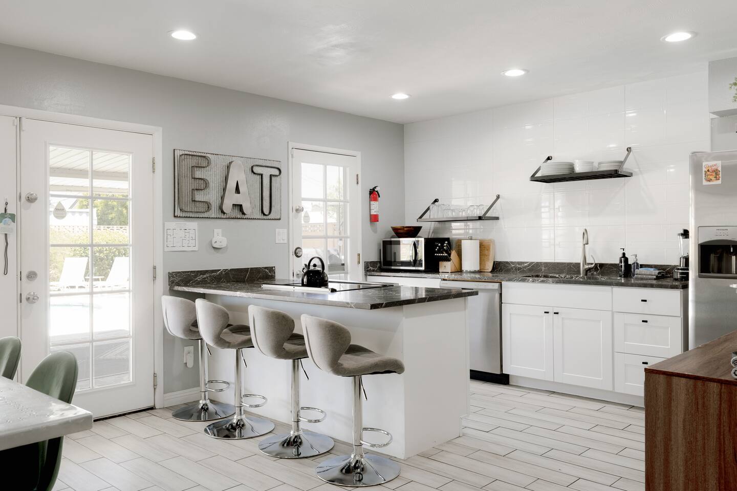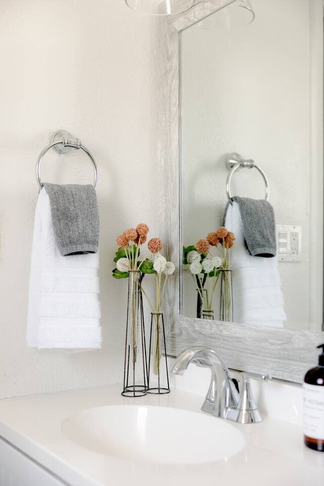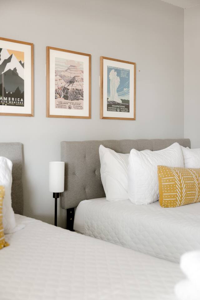 BEDROOMS: -Bedroom 1: King Bed + Private Bathroom w/Shower + 42 inch flat screen smart TV + ceiling fan -Bedroom 2: King Bed + 42 inch flat screen smart TV + ceiling fan -Bedroom 3: Two Queen Beds + 42 inch flat screen smart TV + ceiling fan -Bedroom 4: Twin Over Full Bunk Bed + Twin Bunk Bed BATHROOMS: -Bathroom 1: Walk-in shower + single vanity -Bathroom 2: Walk-in shower and stand alone tub + single vanity -> Both bathrooms come with hair dryers, fluffy towels, hand soap, body soap, shampoo and conditioner. LIVING ROOM - Large 65 inch flat screen smart TV - High speed internet - Live TV included! - Open concept living with living room next to kitchen + dining! - Shuffleboard KITCHEN - Stainless steel appliances - Drip coffee maker includes cream/sugar - Locally roasted Press Coffee provided - Teapot, blender, toaster - Pots, pans, baking dishes - Storage containers for leftovers - Mixing bowls, dish towels, knives - Microwave - Filtered water + ice from the refrigerator POOL + HOT TUB - Optional heated pool with loungers + umbrella - Pool Heat: $65/night or $400/week, Oct–Apr - Hot tub included - Electric air pump for your pool floats! - Pool towels provided - We do not provide floats for safety reasons, but feel free to bring your own! OUTDOORS - Outdoor living complete with couch, bar top, TV, + ping pong! - Fire pit - BBQ grill - Propane tanks provided LAUNDRY - Private washer and dryer - Laundry detergent provided - Iron and ironing board