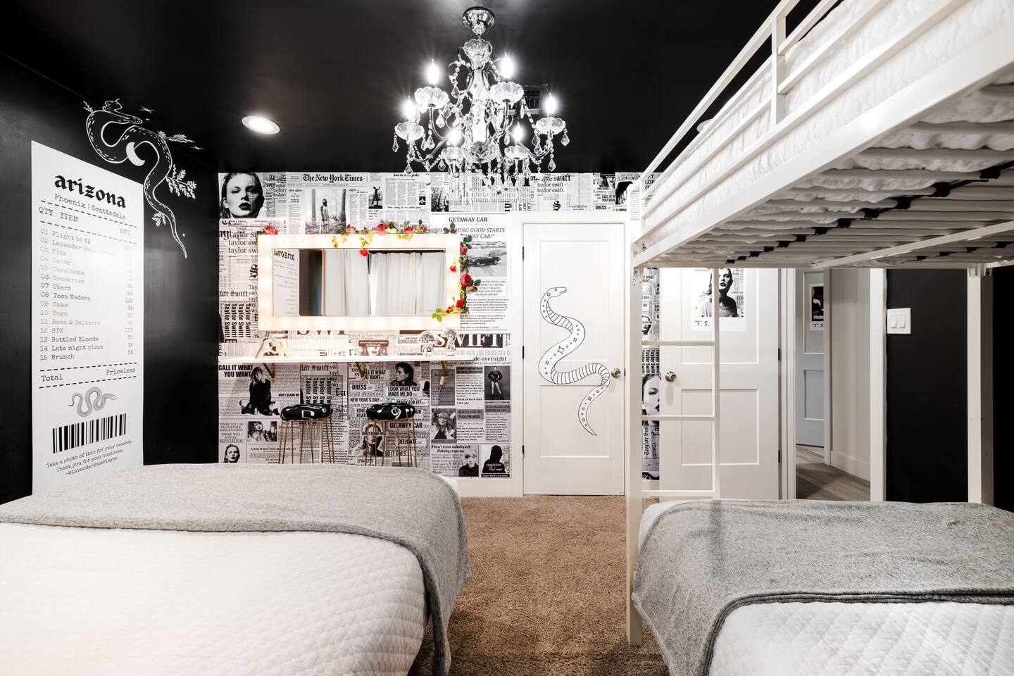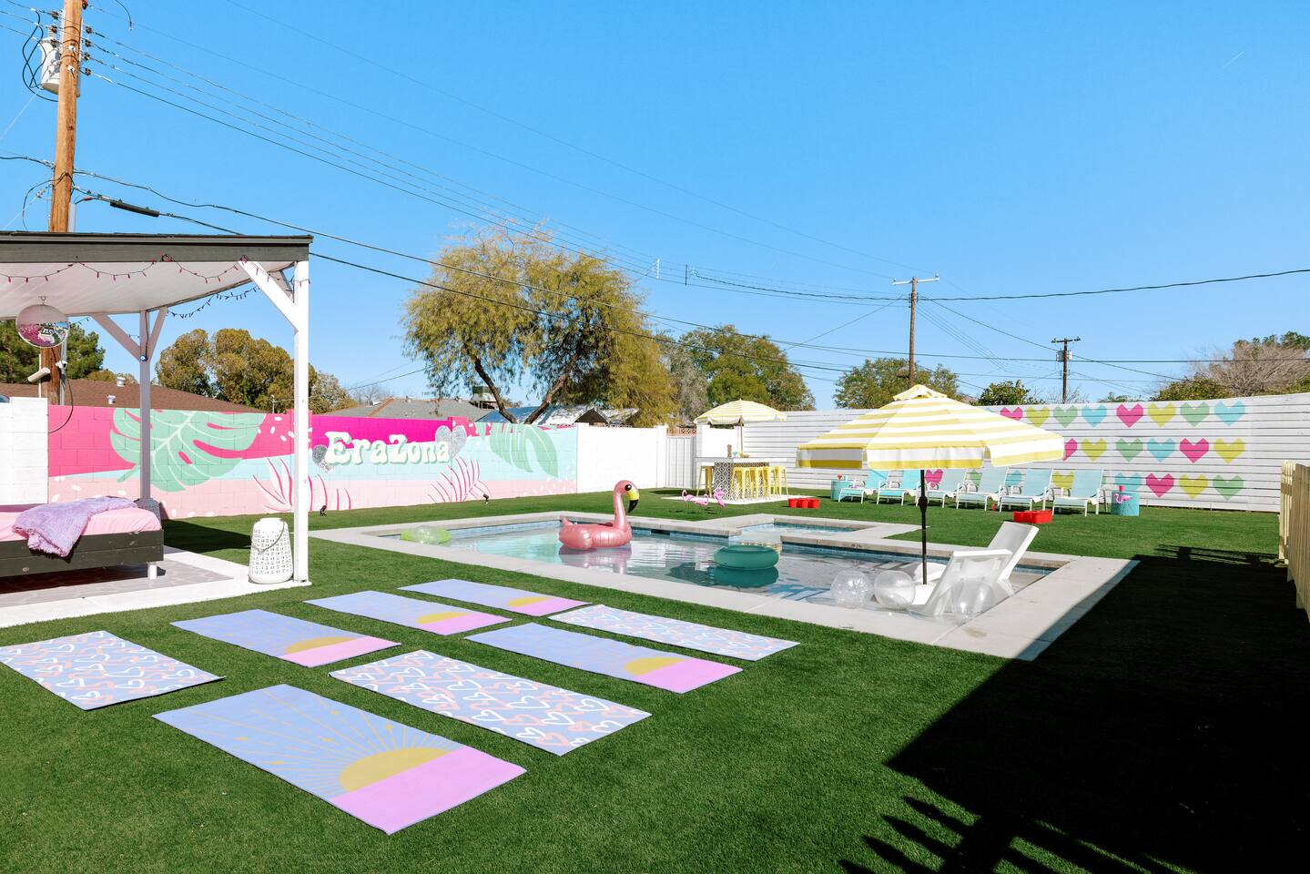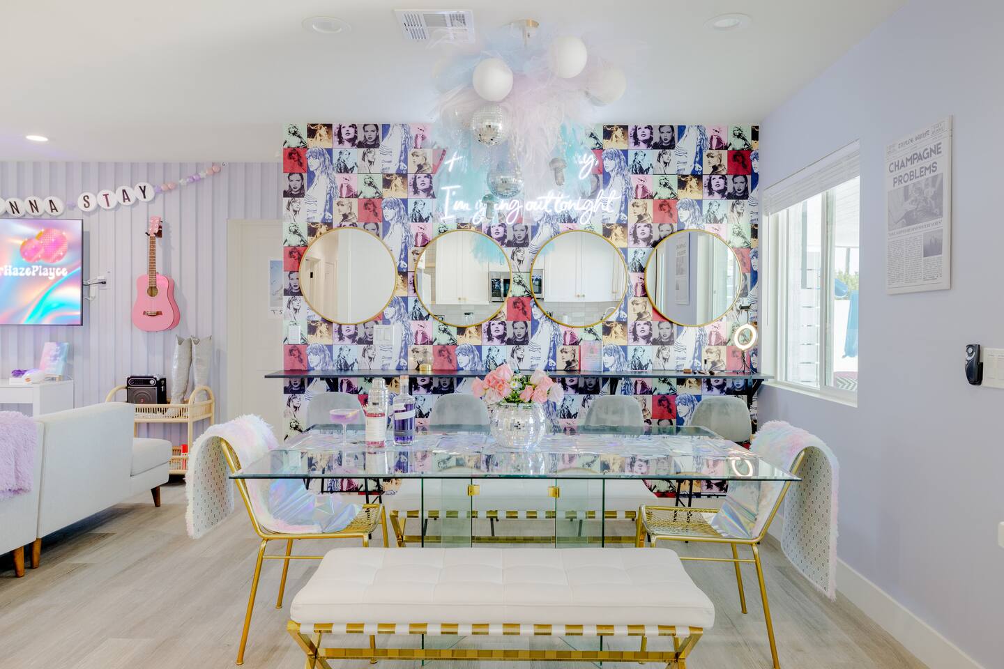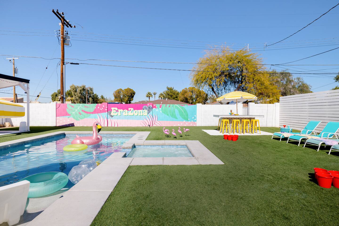 From the creators of #PlayceCollective and designed by celebrity interior designers Lux-Living, this home has been redesigned with some of TS’s most memorable moments. Like our Album Cover Lover Wall and colorful, chic interior, this home is perfect for photo shoots and epic memories with the Swifties in your life! The Eras... BEDROOMS - 1989 Bedroom: King bed, Ensuite bathroom - Folklore Bedroom: King bed - Evermore Bedroom: 2 twins + 2 trundles, glam bar/desk - Reputation Bedroom: Queen bed + Full/double bunks, glam bar -> Each bedroom comes with blackout curtains, soft sheets and mirrors. BATHROOMS - Fearless Bathroom: Ensuite, Walk-in shower, Single vanity - Midnights Bathroom: Hall bath with single vanity, tub/shower combo -> Each bathroom comes with towels, washcloths, hand towel, hair dryer, shampoo, conditioner, body wash, hand soap, TP, toilet spray LOVERS LIVING ROOM - Lovers album - 65" Smart TV - Karaoke machine, games POOL + HOT TUB - 3ft-5ft Deep Swimming Pool - Pool Heat: $65/night or $400/week, Oct–Apr - Baja Shelf w/pool loungers and umbrella - Hot Tub included - Multi-colored Pool Lights - 6 Pool Loungers - Pool towels provided - Electric air pump for your pool floats! *please note: Our pool does not come with a fence surrounding it so watch your children! BACKYARD - Fire Pit - Gas Grill, propane provided to start - 55" Outdoor Smart TV - King Size bed in Pink Cabana - Outdoor Dining for 8 - Outdoor seating for lounging - Two IG-worthy murals - Large artificial grass area - Yoga mats provided! KITCHEN - Fully stocked! - Coffee and tea bar with creamer and sweetener - Cuisinart drip coffee maker, teapot, toaster, blender - Pots, pans, baking dishes and sheets - Storage containers for leftovers - Microwave - Gas stove - Dishwasher with detergent to start - Fridge with ice maker and filtered water - Olive oil and spices to start - Hand soap and dish soap provided - Drinking glasses - Coffee mugs - Wine & Champagne glasses DINING - Indoor Dining for 8 - Illuminated outdoor dining on covered patio for 6 - Poolside bar table w/umbrella ENTERTAINMENT + WIFI - Two TVs: 65” smart tv in the living room, and a 55” Smart tv outside - Use your own login to access a variety of streaming apps. - WiFi internet connection of 325 Mbps LAUNDRY - Front load washer and dryer - Laundry detergent, stain treatment and dryer sheets provided CONCIERGE SERVICE Customize your stay with optional concierge service! After booking, add on options such as: - Stocking the fridge prior to your arrival, no grocery store trip for you! - Margarita bar? G+T Bar? Sangria, Mocktails, you name it! - Light decorations for a Birthday, Bachelorette Party or any other occasion - S'mores kits - Charcuterie Board MOSTESS HOSTS - Hosted by Mostess, a boutique Arizona vacation home host. - Top notch communication through your entire stay - No checkout "chore" list!