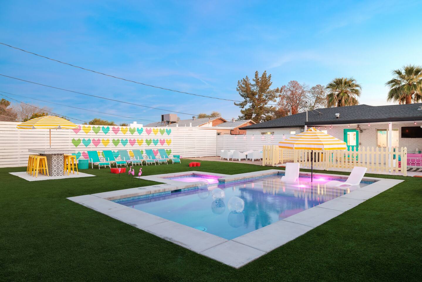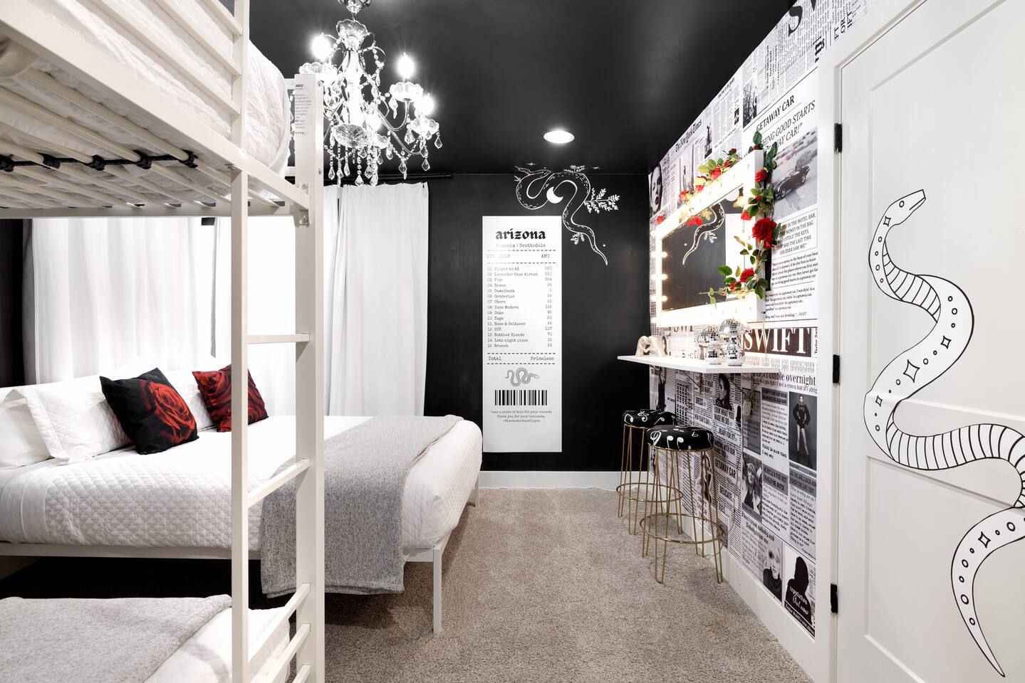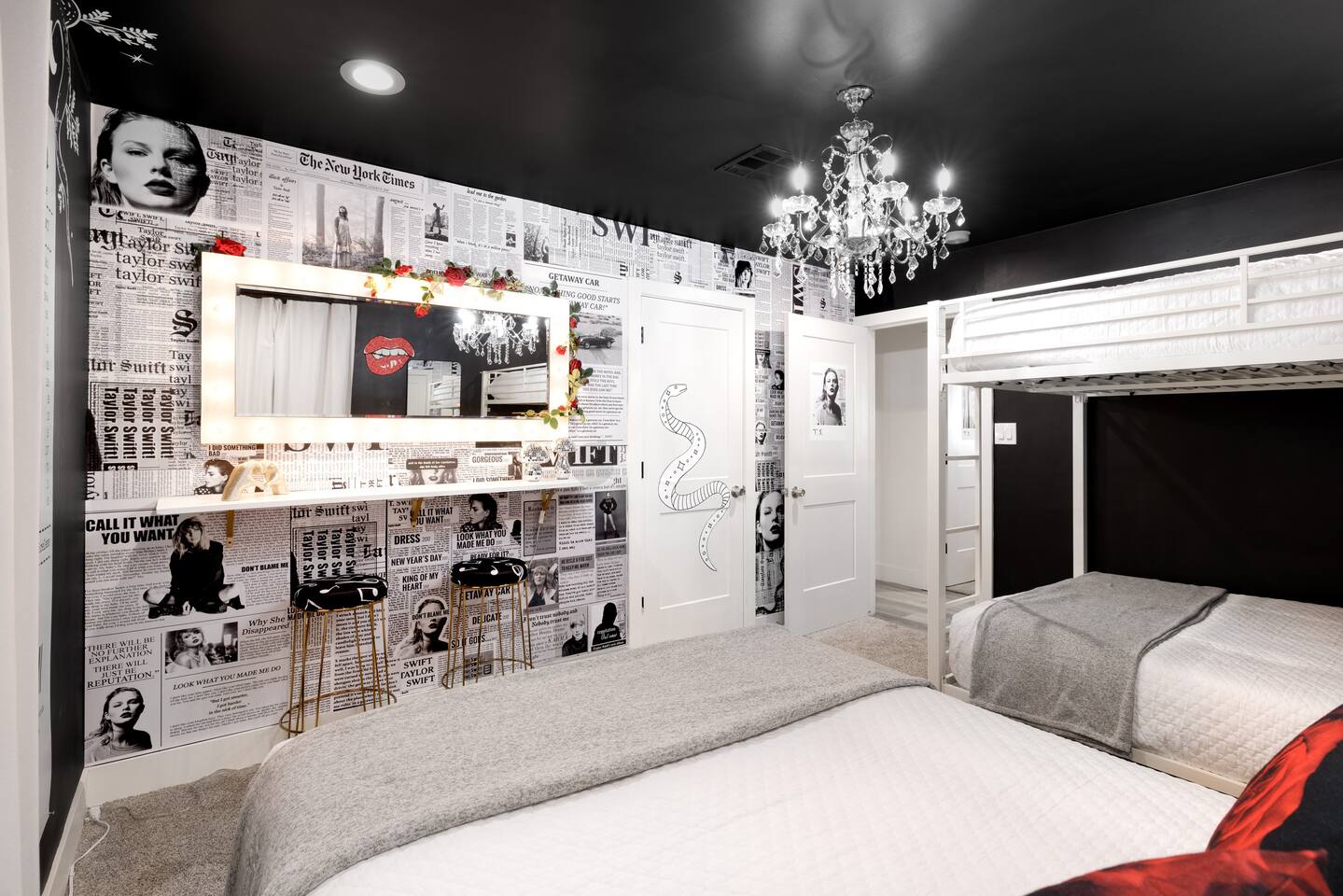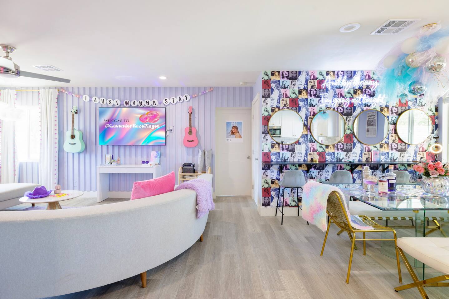 From the creators of #PlayceCollective and designed by celebrity interior designers Lux-Living, this home has been redesigned with some of TS’s most memorable moments. Like our Album Cover Lover Wall and colorful, chic interior, this home is perfect for photo shoots and epic memories with the Swifties in your life! The Eras... BEDROOMS - 1989 Bedroom: King bed, Ensuite bathroom - Folklore Bedroom: King bed - Evermore Bedroom: 2 twins + 2 trundles, glam bar/desk - Reputation Bedroom: Queen bed + Full/double bunks, glam bar -> Each bedroom comes with blackout curtains, soft sheets and mirrors. BATHROOMS - Fearless Bathroom: Ensuite, Walk-in shower, Single vanity - Midnights Bathroom: Hall bath with single vanity, tub/shower combo -> Each bathroom comes with towels, washcloths, hand towel, hair dryer, shampoo, conditioner, body wash, hand soap, TP, toilet spray LOVERS LIVING ROOM - Lovers album - 65" Smart TV - Karaoke machine, games POOL + HOT TUB - 3ft-5ft Deep Swimming Pool - Pool Heat: $65/night or $400/week, Oct–Apr - Baja Shelf w/pool loungers and umbrella - Hot Tub included - Multi-colored Pool Lights - 6 Pool Loungers - Pool towels provided - Electric air pump for your pool floats! *please note: Our pool does not come with a fence surrounding it so watch your children! BACKYARD - Fire Pit - Gas Grill, propane provided to start - 55" Outdoor Smart TV - King Size bed in Pink Cabana - Outdoor Dining for 8 - Outdoor seating for lounging - Two IG-worthy murals - Large artificial grass area - Yoga mats provided! KITCHEN - Fully stocked! - Coffee and tea bar with creamer and sweetener - Cuisinart drip coffee maker, teapot, toaster, blender - Pots, pans, baking dishes and sheets - Storage containers for leftovers - Microwave - Gas stove - Dishwasher with detergent to start - Fridge with ice maker and filtered water - Olive oil and spices to start - Hand soap and dish soap provided - Drinking glasses - Coffee mugs - Wine & Champagne glasses DINING - Indoor Dining for 8 - Illuminated outdoor dining on covered patio for 6 - Poolside bar table w/umbrella ENTERTAINMENT + WIFI - Two TVs: 65” smart tv in the living room, and a 55” Smart tv outside - Use your own login to access a variety of streaming apps. - WiFi internet connection of 325 Mbps LAUNDRY - Front load washer and dryer - Laundry detergent, stain treatment and dryer sheets provided CONCIERGE SERVICE Customize your stay with optional concierge service! After booking, add on options such as: - Stocking the fridge prior to your arrival, no grocery store trip for you! - Margarita bar? G+T Bar? Sangria, Mocktails, you name it! - Light decorations for a Birthday, Bachelorette Party or any other occasion - S'mores kits - Charcuterie Board MOSTESS HOSTS - Hosted by Mostess, a boutique Arizona vacation home host. - Top notch communication through your entire stay - No checkout "chore" list!