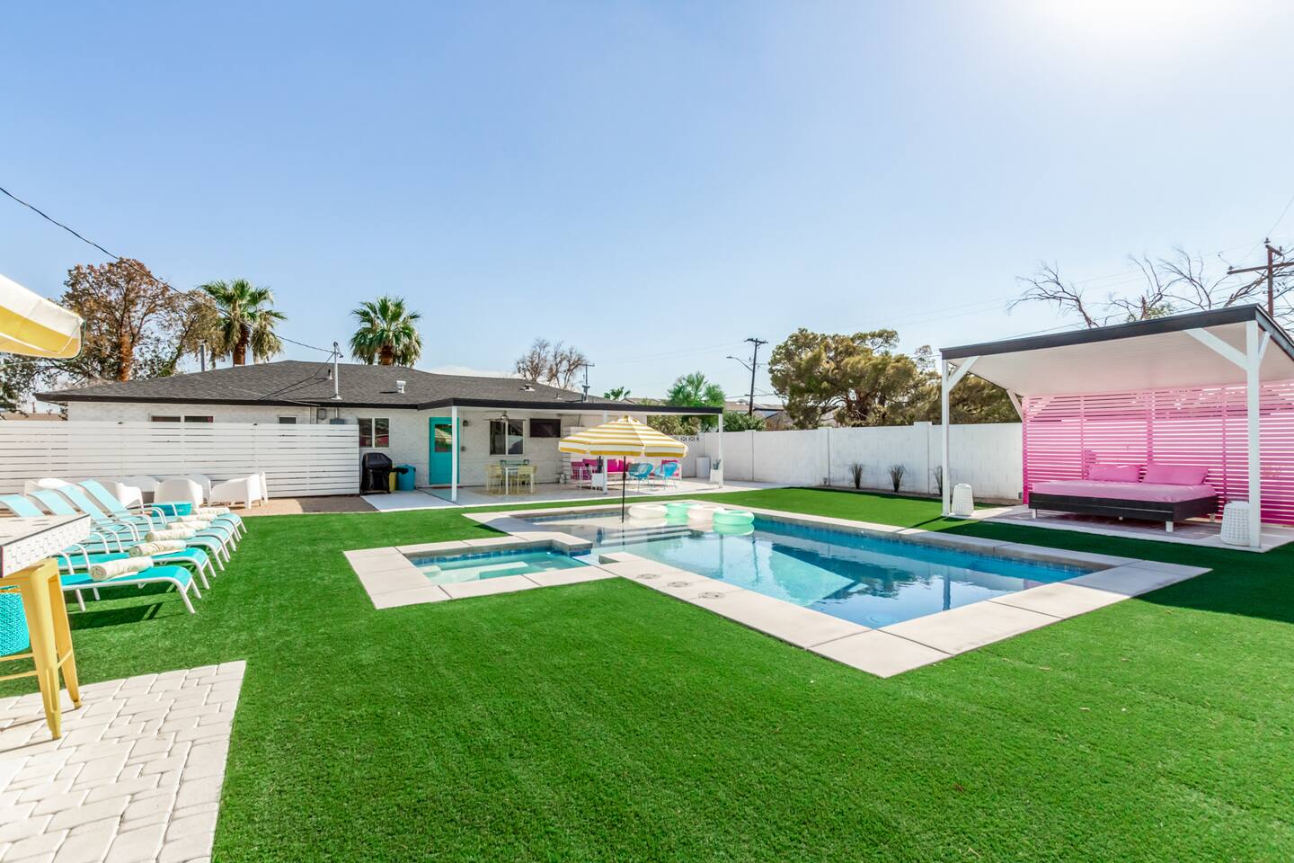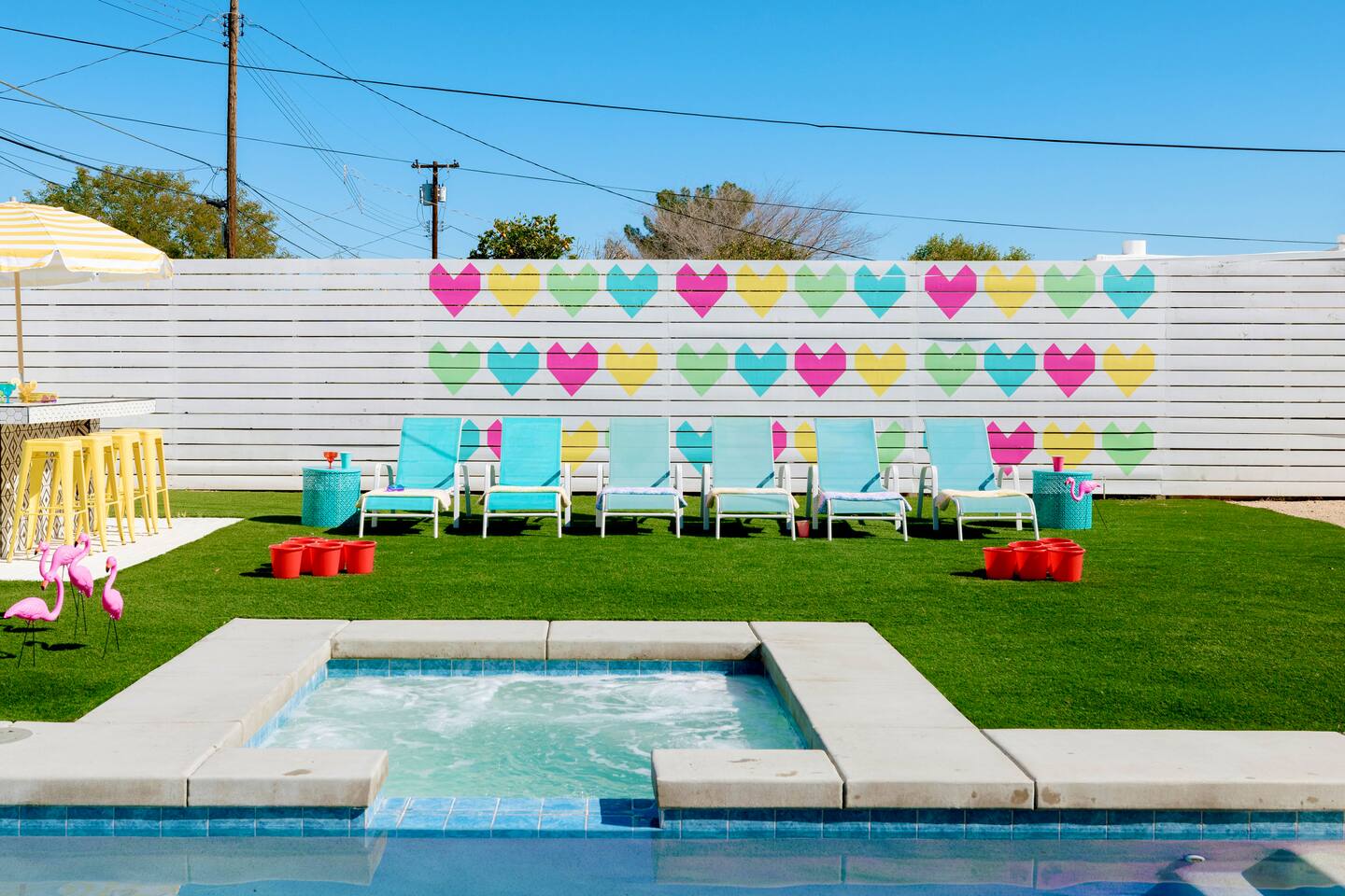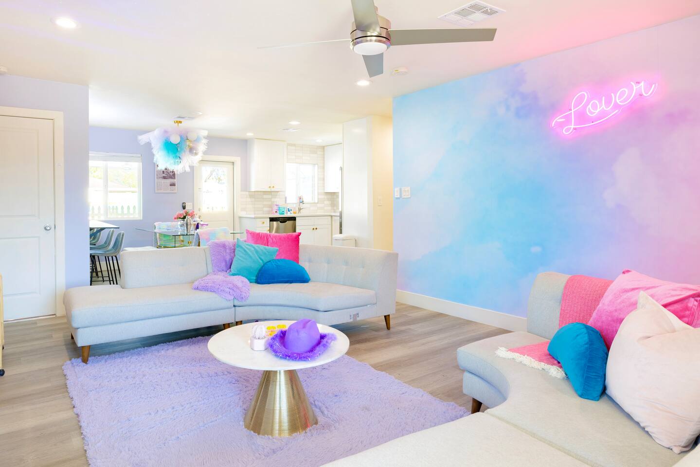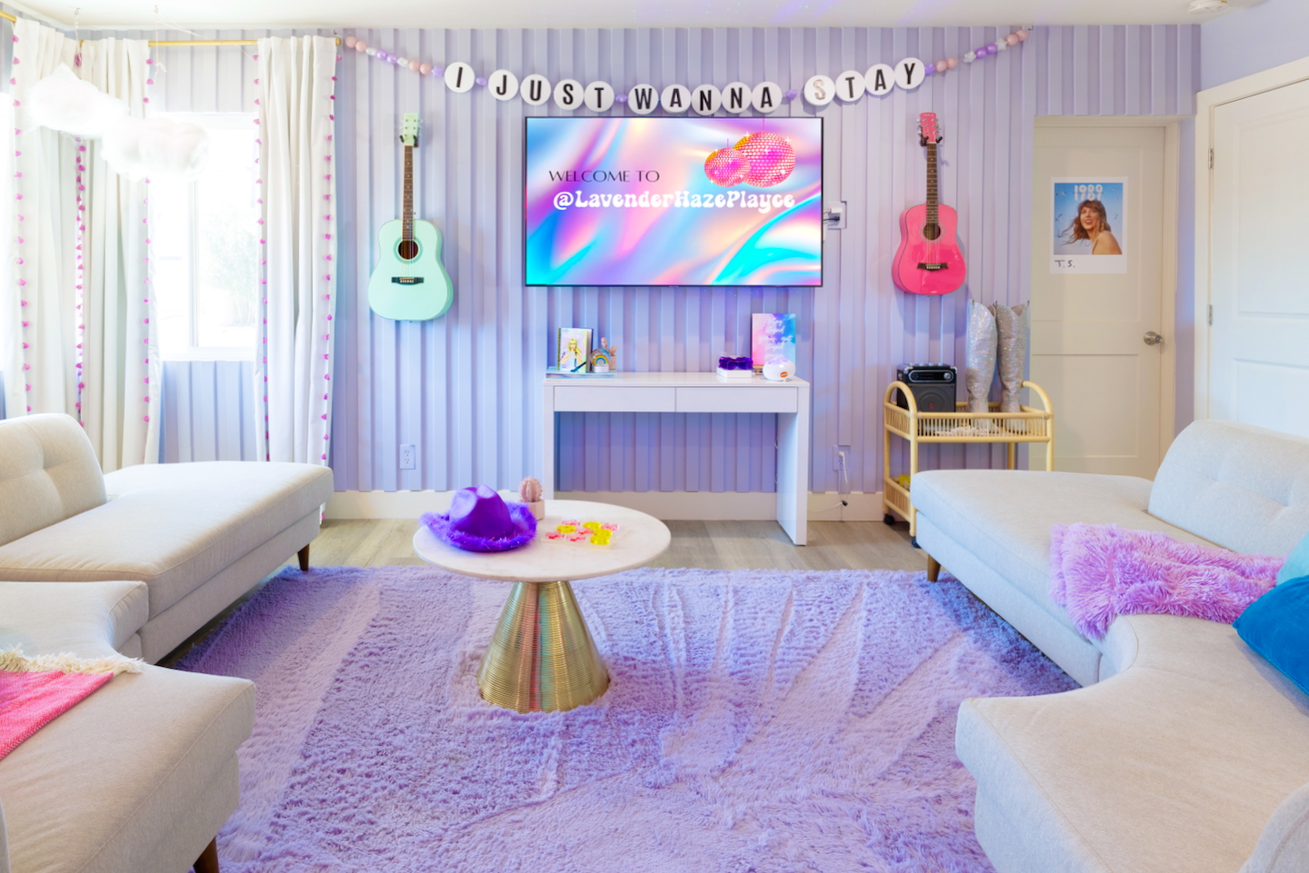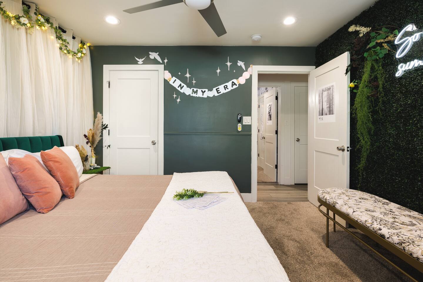 From the creators of #PlayceCollective and designed by celebrity interior designers Lux-Living, this home has been redesigned with some of TS’s most memorable moments. Like our Album Cover Lover Wall and colorful, chic interior, this home is perfect for photo shoots and epic memories with the Swifties in your life! The Eras... BEDROOMS - 1989 Bedroom: King bed, Ensuite bathroom - Folklore Bedroom: King bed - Evermore Bedroom: 2 twins + 2 trundles, glam bar/desk - Reputation Bedroom: Queen bed + Full/double bunks, glam bar -> Each bedroom comes with blackout curtains, soft sheets and mirrors. BATHROOMS - Fearless Bathroom: Ensuite, Walk-in shower, Single vanity - Midnights Bathroom: Hall bath with single vanity, tub/shower combo -> Each bathroom comes with towels, washcloths, hand towel, hair dryer, shampoo, conditioner, body wash, hand soap, TP, toilet spray LOVERS LIVING ROOM - Lovers album - 65" Smart TV - Karaoke machine, games POOL + HOT TUB - 3ft-5ft Deep Swimming Pool - Pool Heat: $65/night or $400/week, Oct–Apr - Baja Shelf w/pool loungers and umbrella - Hot Tub included - Multi-colored Pool Lights - 6 Pool Loungers - Pool towels provided - Electric air pump for your pool floats! *please note: Our pool does not come with a fence surrounding it so watch your children! BACKYARD - Fire Pit - Gas Grill, propane provided to start - 55" Outdoor Smart TV - King Size bed in Pink Cabana - Outdoor Dining for 8 - Outdoor seating for lounging - Two IG-worthy murals - Large artificial grass area - Yoga mats provided! KITCHEN - Fully stocked! - Coffee and tea bar with creamer and sweetener - Cuisinart drip coffee maker, teapot, toaster, blender - Pots, pans, baking dishes and sheets - Storage containers for leftovers - Microwave - Gas stove - Dishwasher with detergent to start - Fridge with ice maker and filtered water - Olive oil and spices to start - Hand soap and dish soap provided - Drinking glasses - Coffee mugs - Wine & Champagne glasses DINING - Indoor Dining for 8 - Illuminated outdoor dining on covered patio for 6 - Poolside bar table w/umbrella ENTERTAINMENT + WIFI - Two TVs: 65” smart tv in the living room, and a 55” Smart tv outside - Use your own login to access a variety of streaming apps. - WiFi internet connection of 325 Mbps LAUNDRY - Front load washer and dryer - Laundry detergent, stain treatment and dryer sheets provided CONCIERGE SERVICE Customize your stay with optional concierge service! After booking, add on options such as: - Stocking the fridge prior to your arrival, no grocery store trip for you! - Margarita bar? G+T Bar? Sangria, Mocktails, you name it! - Light decorations for a Birthday, Bachelorette Party or any other occasion - S'mores kits - Charcuterie Board MOSTESS HOSTS - Hosted by Mostess, a boutique Arizona vacation home host. - Top notch communication through your entire stay - No checkout "chore" list!