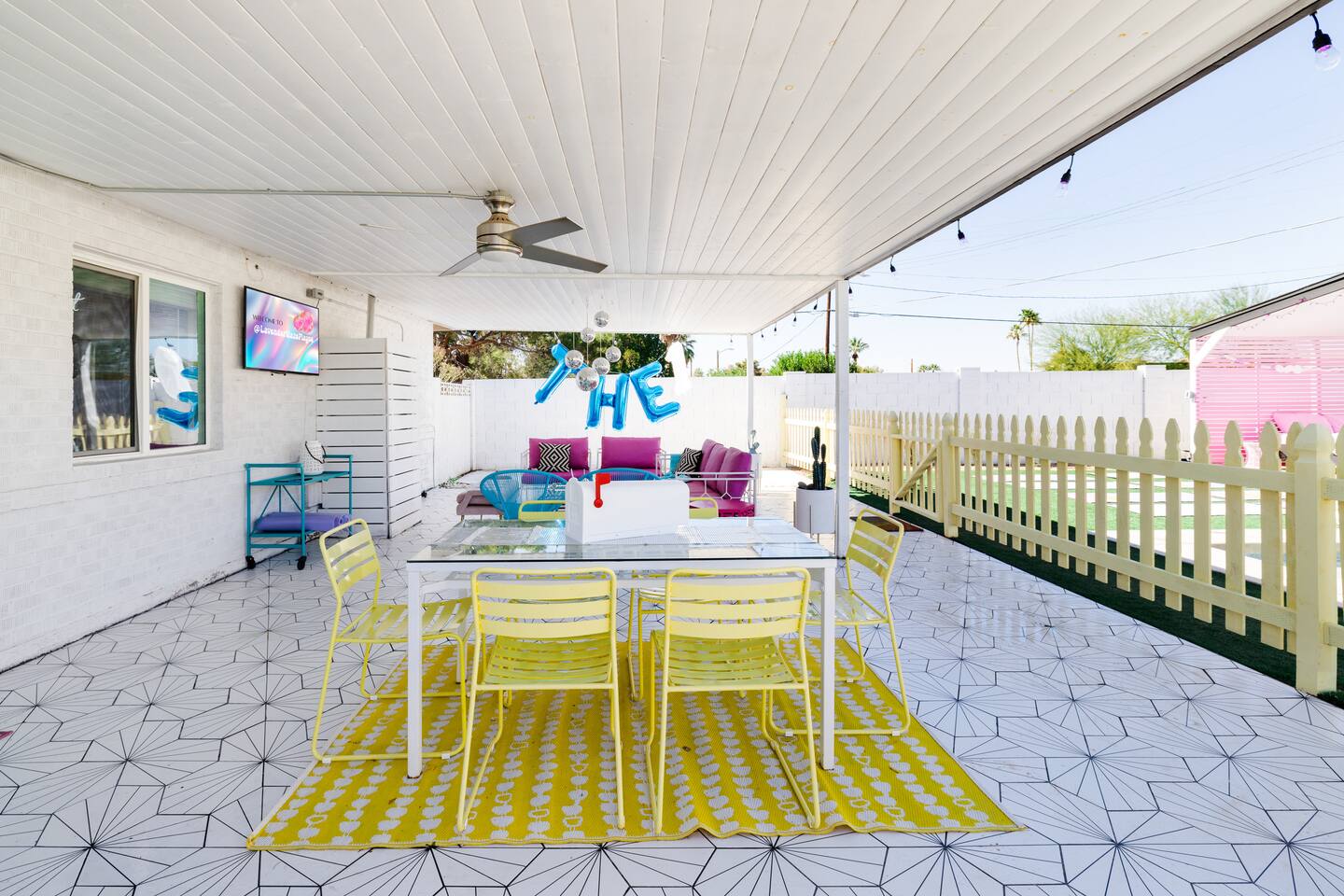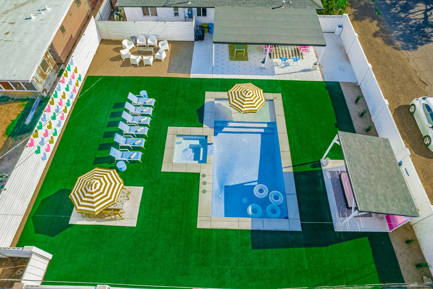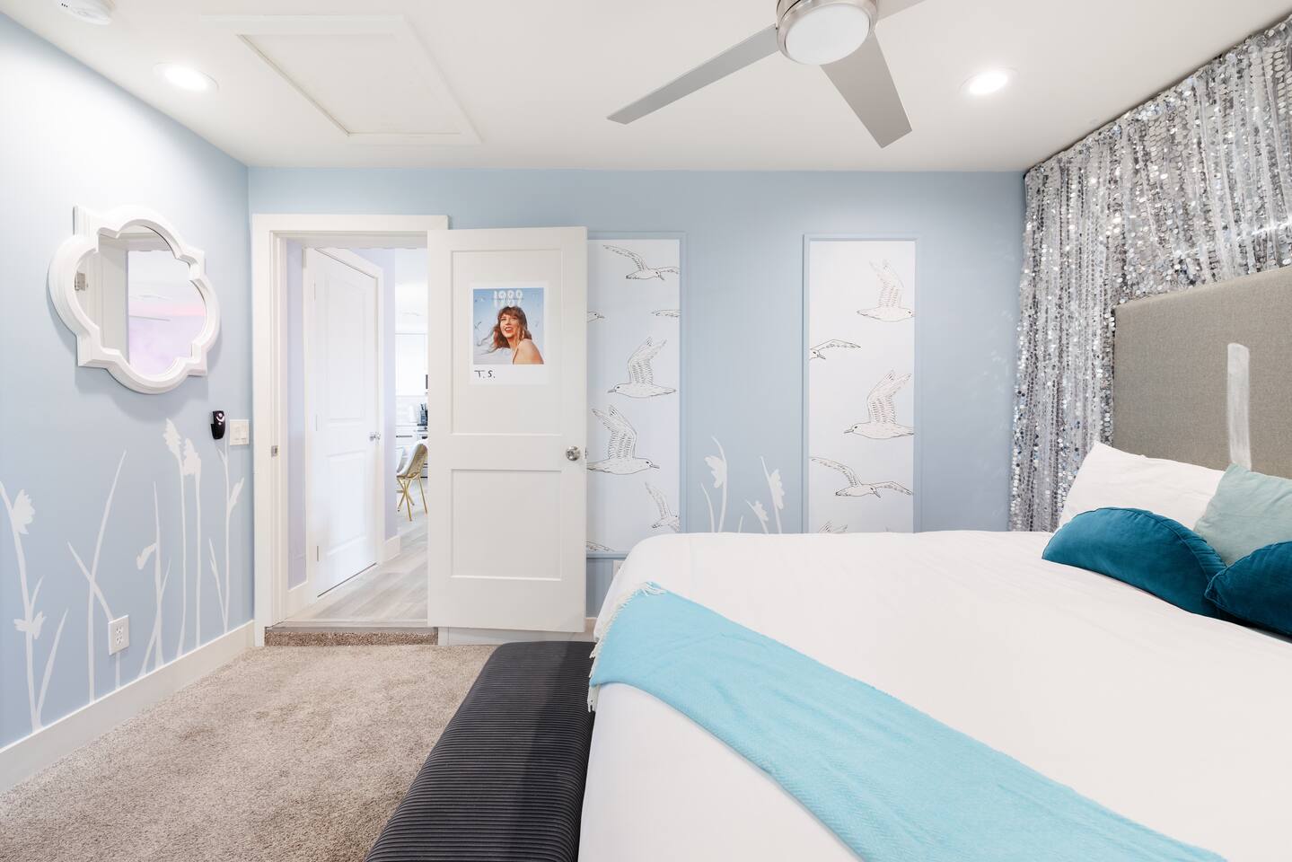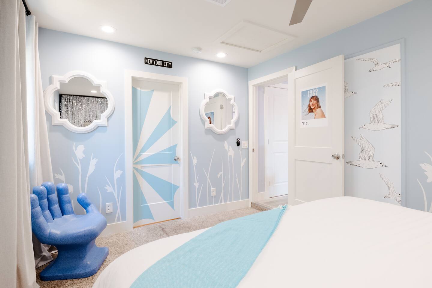 From the creators of #PlayceCollective and designed by celebrity interior designers Lux-Living, this home has been redesigned with some of TS’s most memorable moments. Like our Album Cover Lover Wall and colorful, chic interior, this home is perfect for photo shoots and epic memories with the Swifties in your life! The Eras... BEDROOMS - 1989 Bedroom: King bed, Ensuite bathroom - Folklore Bedroom: King bed - Evermore Bedroom: 2 twins + 2 trundles, glam bar/desk - Reputation Bedroom: Queen bed + Full/double bunks, glam bar -> Each bedroom comes with blackout curtains, soft sheets and mirrors. BATHROOMS - Fearless Bathroom: Ensuite, Walk-in shower, Single vanity - Midnights Bathroom: Hall bath with single vanity, tub/shower combo -> Each bathroom comes with towels, washcloths, hand towel, hair dryer, shampoo, conditioner, body wash, hand soap, TP, toilet spray LOVERS LIVING ROOM - Lovers album - 65" Smart TV - Karaoke machine, games POOL + HOT TUB - 3ft-5ft Deep Swimming Pool - Pool Heat: $65/night or $400/week, Oct–Apr - Baja Shelf w/pool loungers and umbrella - Hot Tub included - Multi-colored Pool Lights - 6 Pool Loungers - Pool towels provided - Electric air pump for your pool floats! *please note: Our pool does not come with a fence surrounding it so watch your children! BACKYARD - Fire Pit - Gas Grill, propane provided to start - 55" Outdoor Smart TV - King Size bed in Pink Cabana - Outdoor Dining for 8 - Outdoor seating for lounging - Two IG-worthy murals - Large artificial grass area - Yoga mats provided! KITCHEN - Fully stocked! - Coffee and tea bar with creamer and sweetener - Cuisinart drip coffee maker, teapot, toaster, blender - Pots, pans, baking dishes and sheets - Storage containers for leftovers - Microwave - Gas stove - Dishwasher with detergent to start - Fridge with ice maker and filtered water - Olive oil and spices to start - Hand soap and dish soap provided - Drinking glasses - Coffee mugs - Wine & Champagne glasses DINING - Indoor Dining for 8 - Illuminated outdoor dining on covered patio for 6 - Poolside bar table w/umbrella ENTERTAINMENT + WIFI - Two TVs: 65” smart tv in the living room, and a 55” Smart tv outside - Use your own login to access a variety of streaming apps. - WiFi internet connection of 325 Mbps LAUNDRY - Front load washer and dryer - Laundry detergent, stain treatment and dryer sheets provided CONCIERGE SERVICE Customize your stay with optional concierge service! After booking, add on options such as: - Stocking the fridge prior to your arrival, no grocery store trip for you! - Margarita bar? G+T Bar? Sangria, Mocktails, you name it! - Light decorations for a Birthday, Bachelorette Party or any other occasion - S'mores kits - Charcuterie Board MOSTESS HOSTS - Hosted by Mostess, a boutique Arizona vacation home host. - Top notch communication through your entire stay - No checkout "chore" list!
