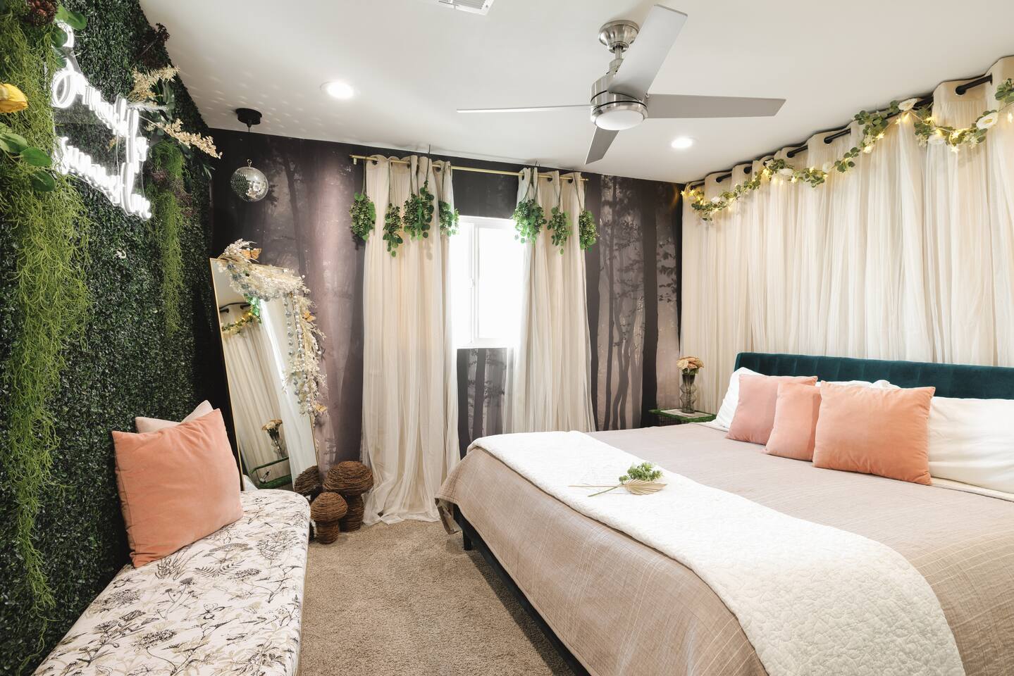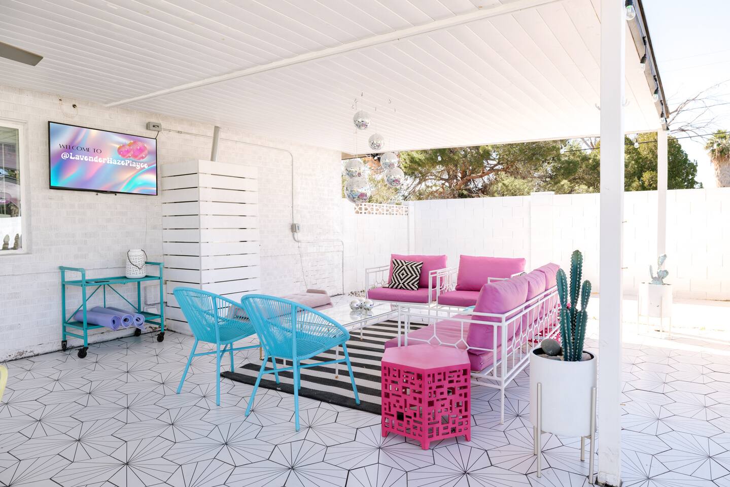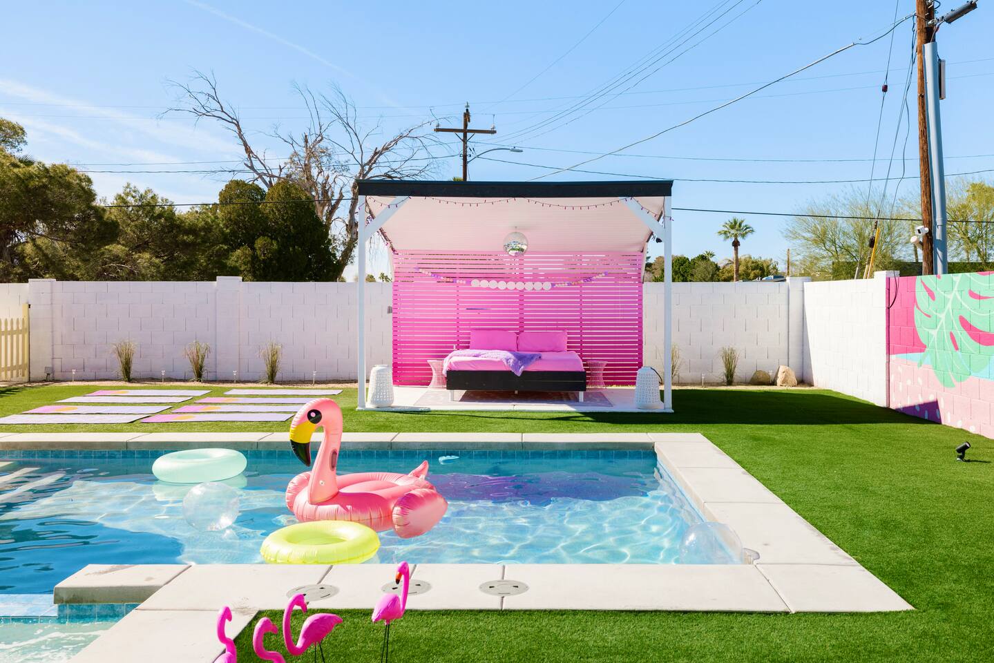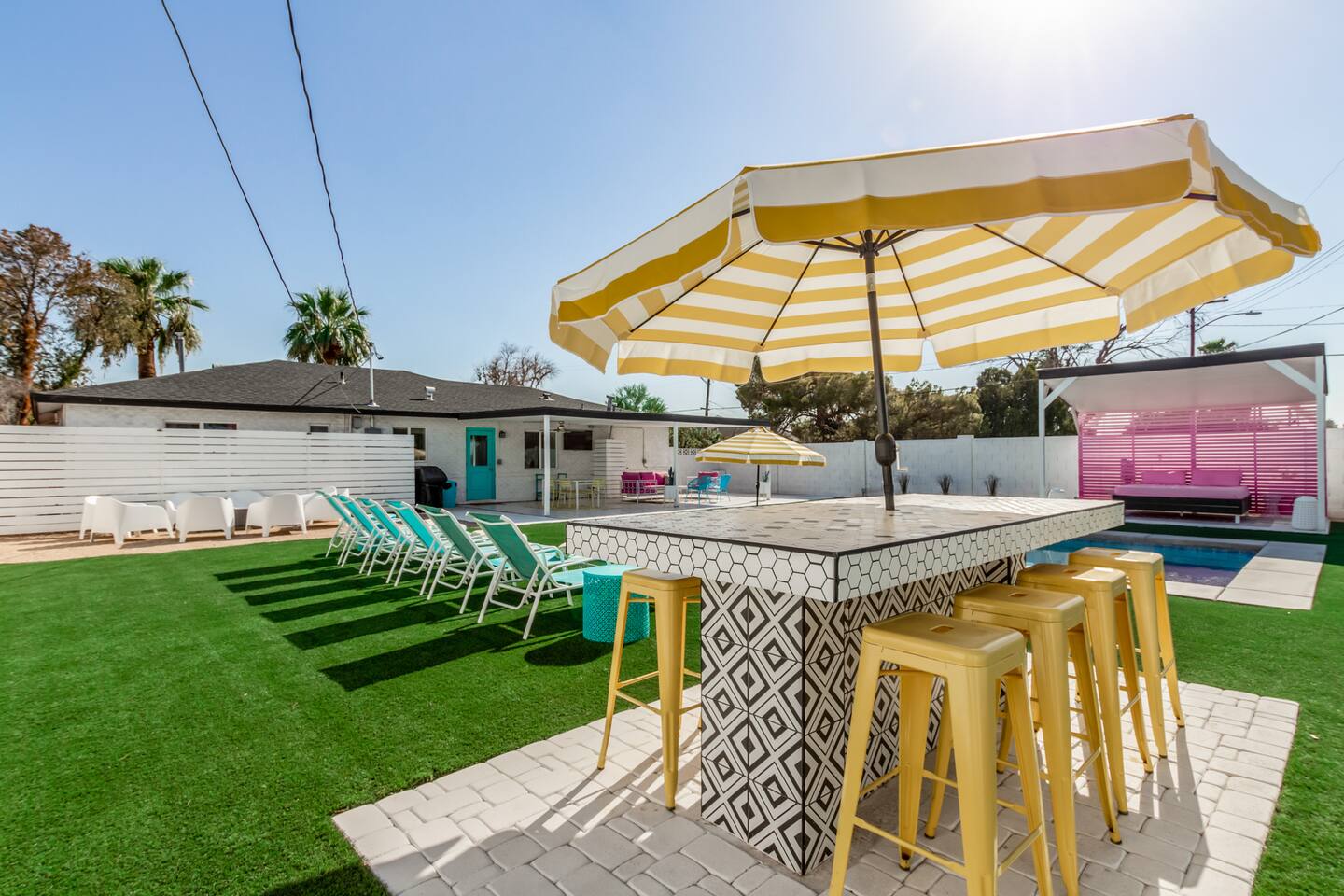 From the creators of #PlayceCollective and designed by celebrity interior designers Lux-Living, this home has been redesigned with some of TS’s most memorable moments. Like our Album Cover Lover Wall and colorful, chic interior, this home is perfect for photo shoots and epic memories with the Swifties in your life! The Eras... BEDROOMS - 1989 Bedroom: King bed, Ensuite bathroom - Folklore Bedroom: King bed - Evermore Bedroom: 2 twins + 2 trundles, glam bar/desk - Reputation Bedroom: Queen bed + Full/double bunks, glam bar -> Each bedroom comes with blackout curtains, soft sheets and mirrors. BATHROOMS - Fearless Bathroom: Ensuite, Walk-in shower, Single vanity - Midnights Bathroom: Hall bath with single vanity, tub/shower combo -> Each bathroom comes with towels, washcloths, hand towel, hair dryer, shampoo, conditioner, body wash, hand soap, TP, toilet spray LOVERS LIVING ROOM - Lovers album - 65" Smart TV - Karaoke machine, games POOL + HOT TUB - 3ft-5ft Deep Swimming Pool - Pool Heat: $65/night or $400/week, Oct–Apr - Baja Shelf w/pool loungers and umbrella - Hot Tub included - Multi-colored Pool Lights - 6 Pool Loungers - Pool towels provided - Electric air pump for your pool floats! *please note: Our pool does not come with a fence surrounding it so watch your children! BACKYARD - Fire Pit - Gas Grill, propane provided to start - 55" Outdoor Smart TV - King Size bed in Pink Cabana - Outdoor Dining for 8 - Outdoor seating for lounging - Two IG-worthy murals - Large artificial grass area - Yoga mats provided! KITCHEN - Fully stocked! - Coffee and tea bar with creamer and sweetener - Cuisinart drip coffee maker, teapot, toaster, blender - Pots, pans, baking dishes and sheets - Storage containers for leftovers - Microwave - Gas stove - Dishwasher with detergent to start - Fridge with ice maker and filtered water - Olive oil and spices to start - Hand soap and dish soap provided - Drinking glasses - Coffee mugs - Wine & Champagne glasses DINING - Indoor Dining for 8 - Illuminated outdoor dining on covered patio for 6 - Poolside bar table w/umbrella ENTERTAINMENT + WIFI - Two TVs: 65” smart tv in the living room, and a 55” Smart tv outside - Use your own login to access a variety of streaming apps. - WiFi internet connection of 325 Mbps LAUNDRY - Front load washer and dryer - Laundry detergent, stain treatment and dryer sheets provided CONCIERGE SERVICE Customize your stay with optional concierge service! After booking, add on options such as: - Stocking the fridge prior to your arrival, no grocery store trip for you! - Margarita bar? G+T Bar? Sangria, Mocktails, you name it! - Light decorations for a Birthday, Bachelorette Party or any other occasion - S'mores kits - Charcuterie Board MOSTESS HOSTS - Hosted by Mostess, a boutique Arizona vacation home host. - Top notch communication through your entire stay - No checkout "chore" list!