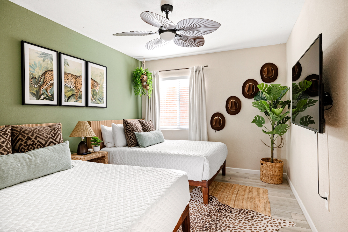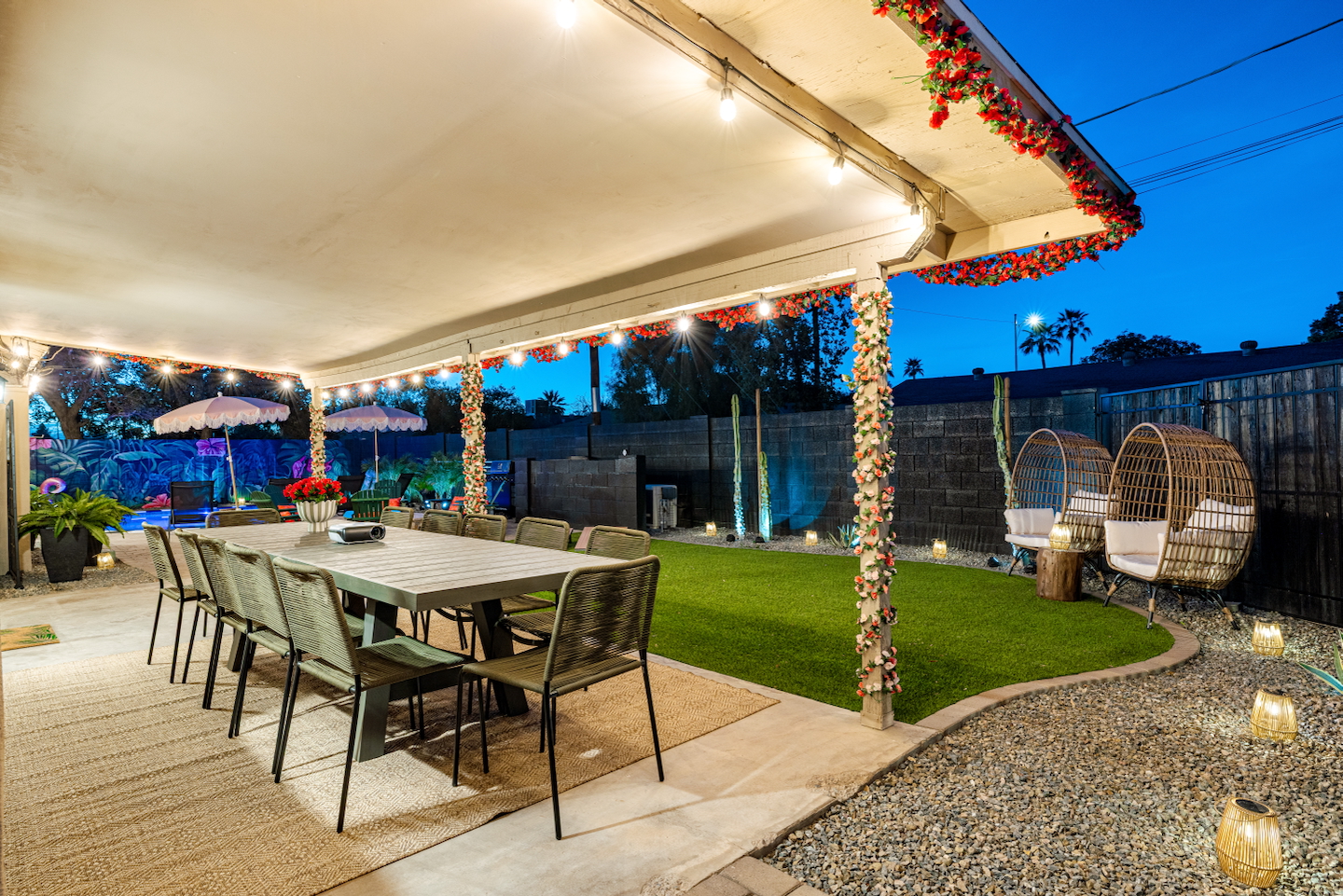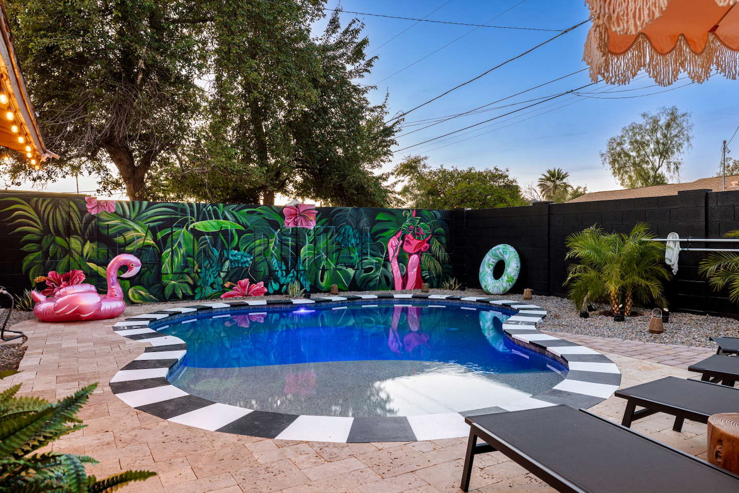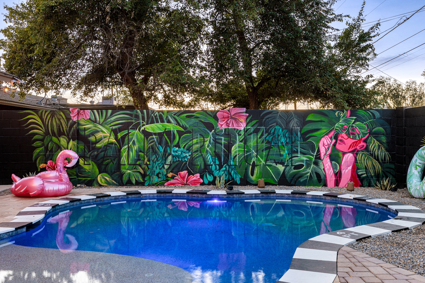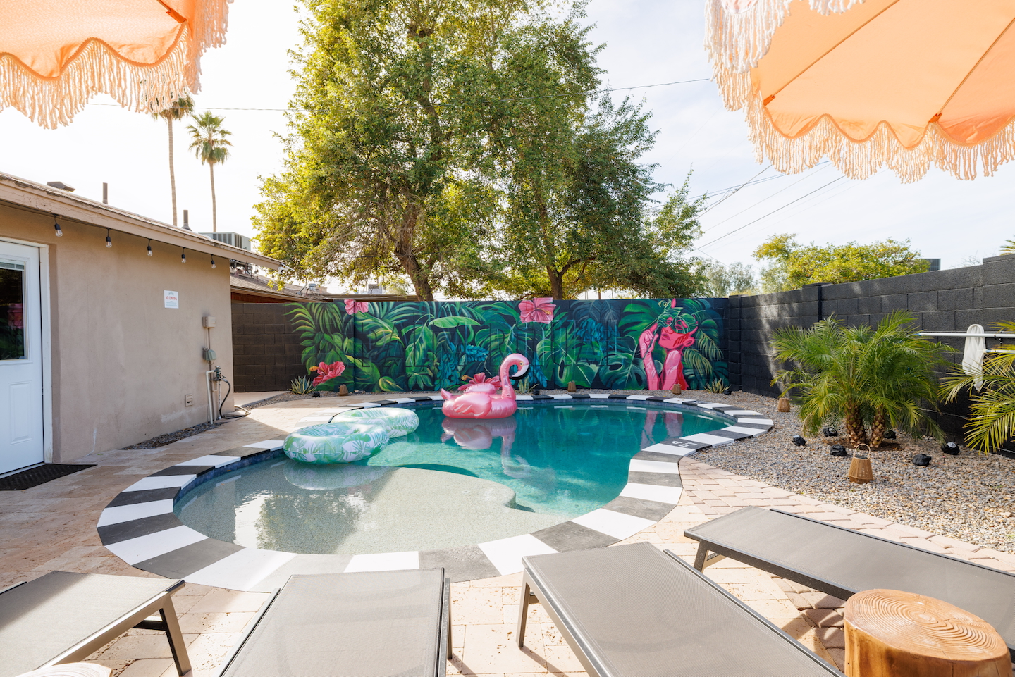 BACKYARD OASIS: Step outside into your personal resort. The backyard is a true social hub, centered around a sparkling heated pool and built in fire pit. Fire up the grill and enjoy dining alfresco. As evening arrives, head out to Old Town or take advantage of the pop up movie screen with projector. The yard is perfect for morning yoga (mats provided!) or lawn games. - Heated pool, heating optional Oct-April - Fire Pit with chairs - Covered Outdoor dining - Yard for Yoga or games, mats provided! INSIDE The fun continues! Get ready for a night out in the glam bar area, or chill with friends for some karaoke. The living room features a large Smart TV, fireplace and high-speed WiFi, perfect for streaming your favorite shows and movies after a day of exploring Scottsdale. BEDROOMS SIX comfortable bedrooms provide restful spaces for everyone in your group. Bedroom 1: King bed Bedroom 2: King Bedroom 3: Queen Bedroom 4: 2 x Queens Bedroom 5: 2 x Queens Bedroom 6: 2 x Full over full bunks BATHROOMS All bathrooms are stocked with plush towels, washcloths, hand towel, hair dryer, shampoo, conditioner, body wash, hand soap, TP, toilet spray. - Primary Bath Ensuite: double vanity, walk-in shower - Second Bath: single vanity, walk-in shower - Third Bath: double vanity, tub/shower combo KITCHEN Prepare delicious meals in the large, fully stocked Chef's Kitchen. It’s equipped with everything you need, from a locally roasted coffee and tea bar to start your day, to all the pots, pans, and dishes for a group feast. The island offers extra seating for casual bites, while the main dining table seats 8. - Large and fully stocked Chef's Kitchen! - Locally roasted Press Coffee + tea bar, creamer, sweetener - Coffee pot, teapot, toaster, blender - Pots, pans, baking dishes and sheets - Storage containers for leftovers - Drinking + wine glasses - Microwave - Electric range - Dishwasher with detergent - Fridge with ice maker and filtered water - Hand soap and dish soap provided - Salt, pepper, olive oil to start DINING - Dining table seats 8 ENTERTAINMENT - High Speed WIFI - SmartTVs - Use your own login to access a variety of streaming apps - No live TV at this time, unless you have your own login POOL + HOT TUB - Private heated pool - Pool Heat: $65/night USD or $400/week USD, Oct–Apr - Pool side loungers - Electric air pump for your pool floats - Pool towels provided *please note: while the property is fenced in, the pool does not have a dedicated fence LAUNDRY - Laundry detergent, stain remover and dryer sheets provided - Iron, ironing board and steamer PARKING We have parking for 2 in the driveway and on-street for 2.