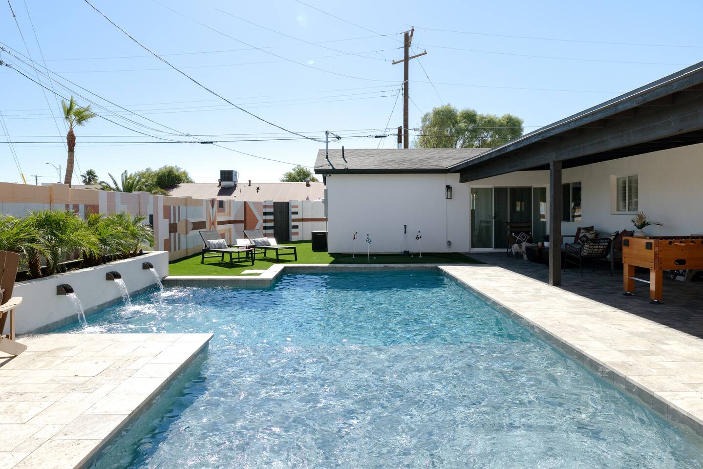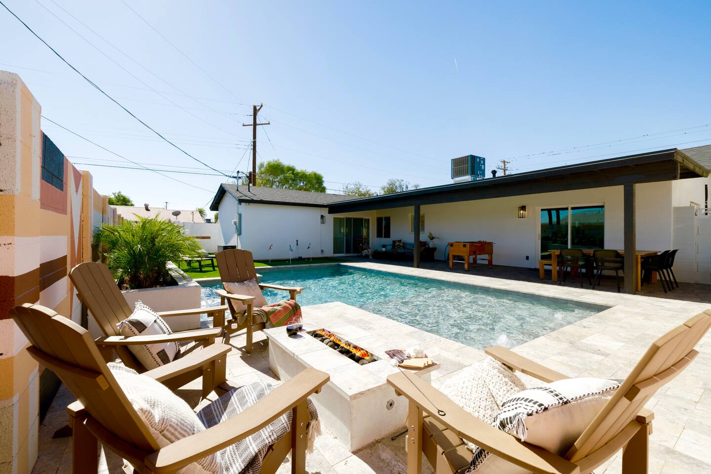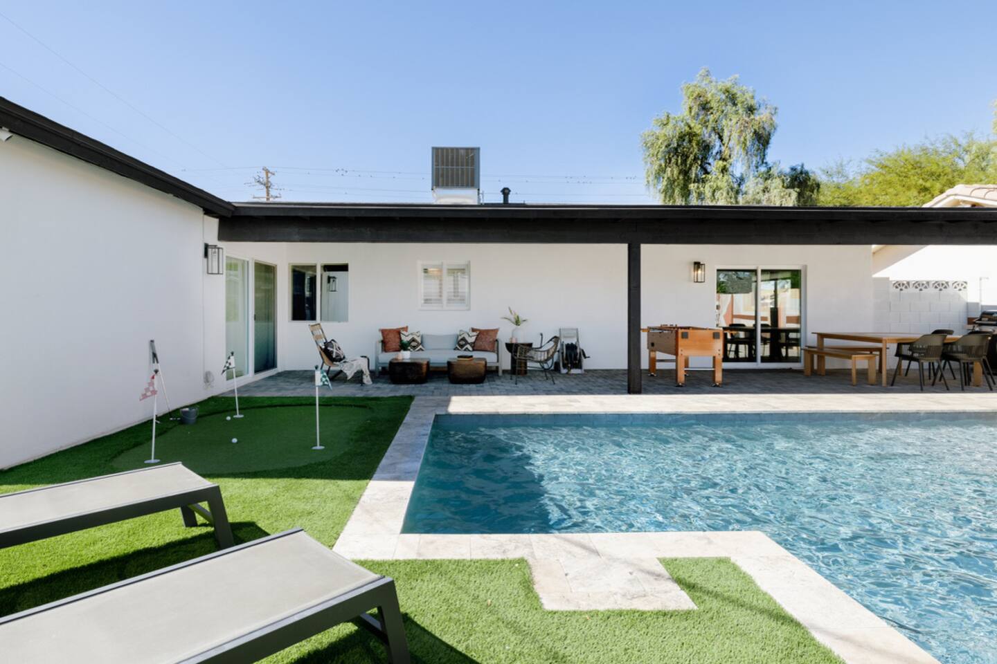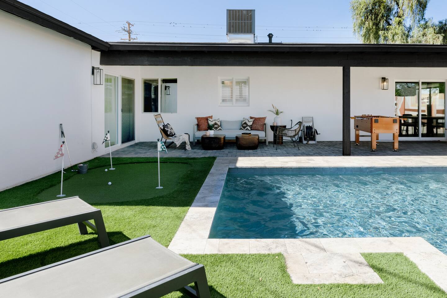 -4 Min to Old Town Scottsdale! -Plunge Pool w/waterfalls, heat fee* -Gas Fire Pit, Weber Grill, Stocked Kitchen -Putting Green, Foosball Table, Cornhole -85" Smart TV, Wifi up to 500Mbps -Concierge Service: Stock the fridge, cheese board, marg bar, decor **Arriving early or leaving late? Ask us about our half day add-on, if our calendar allows it.