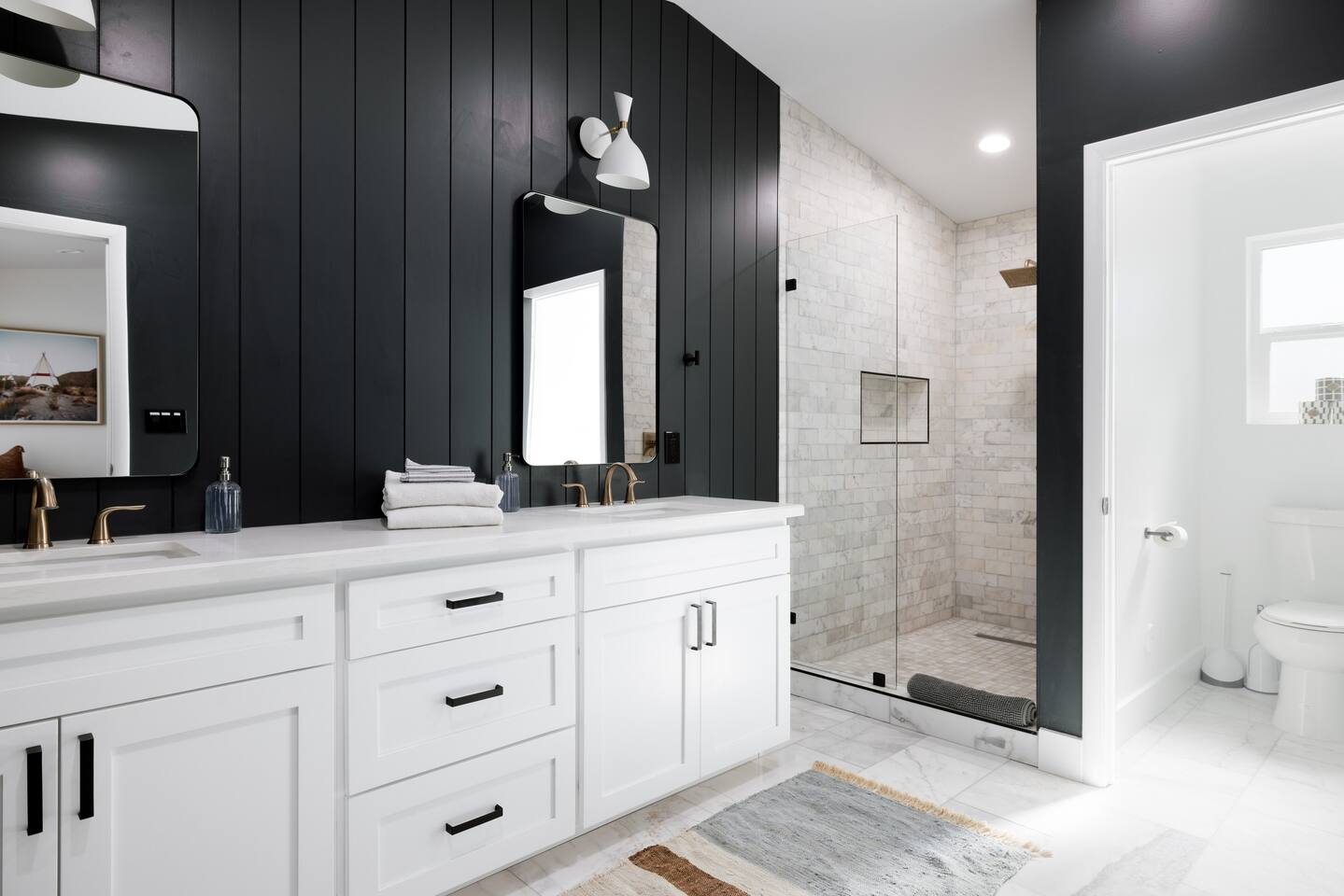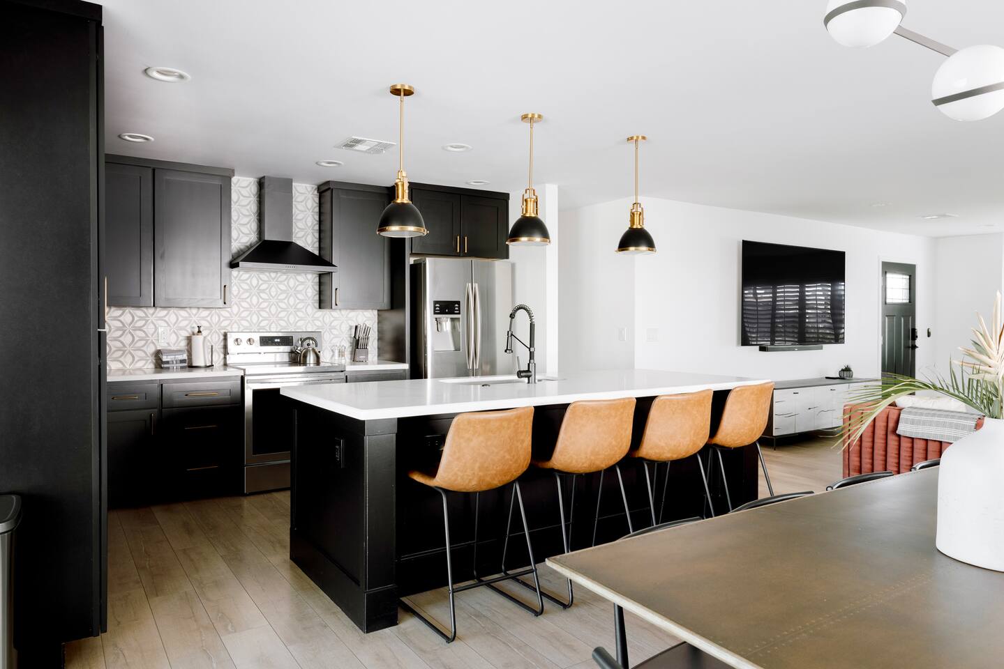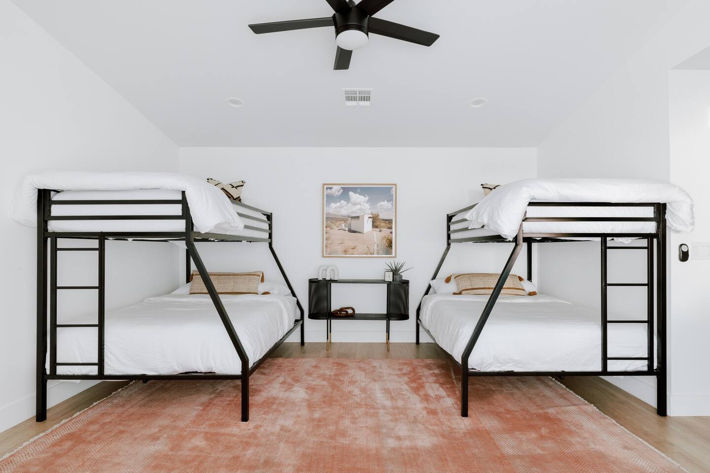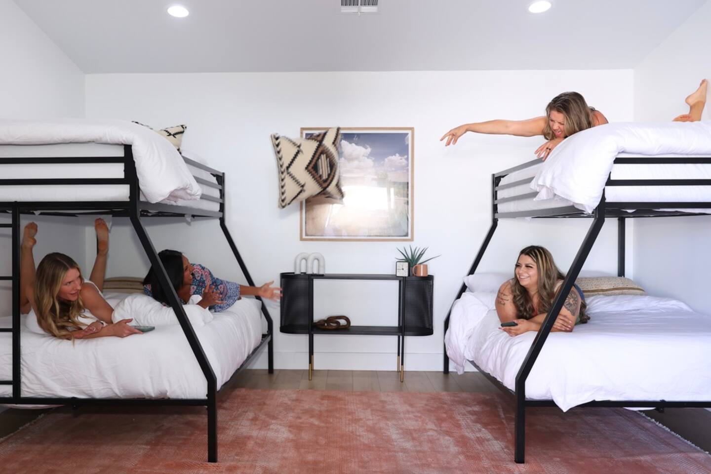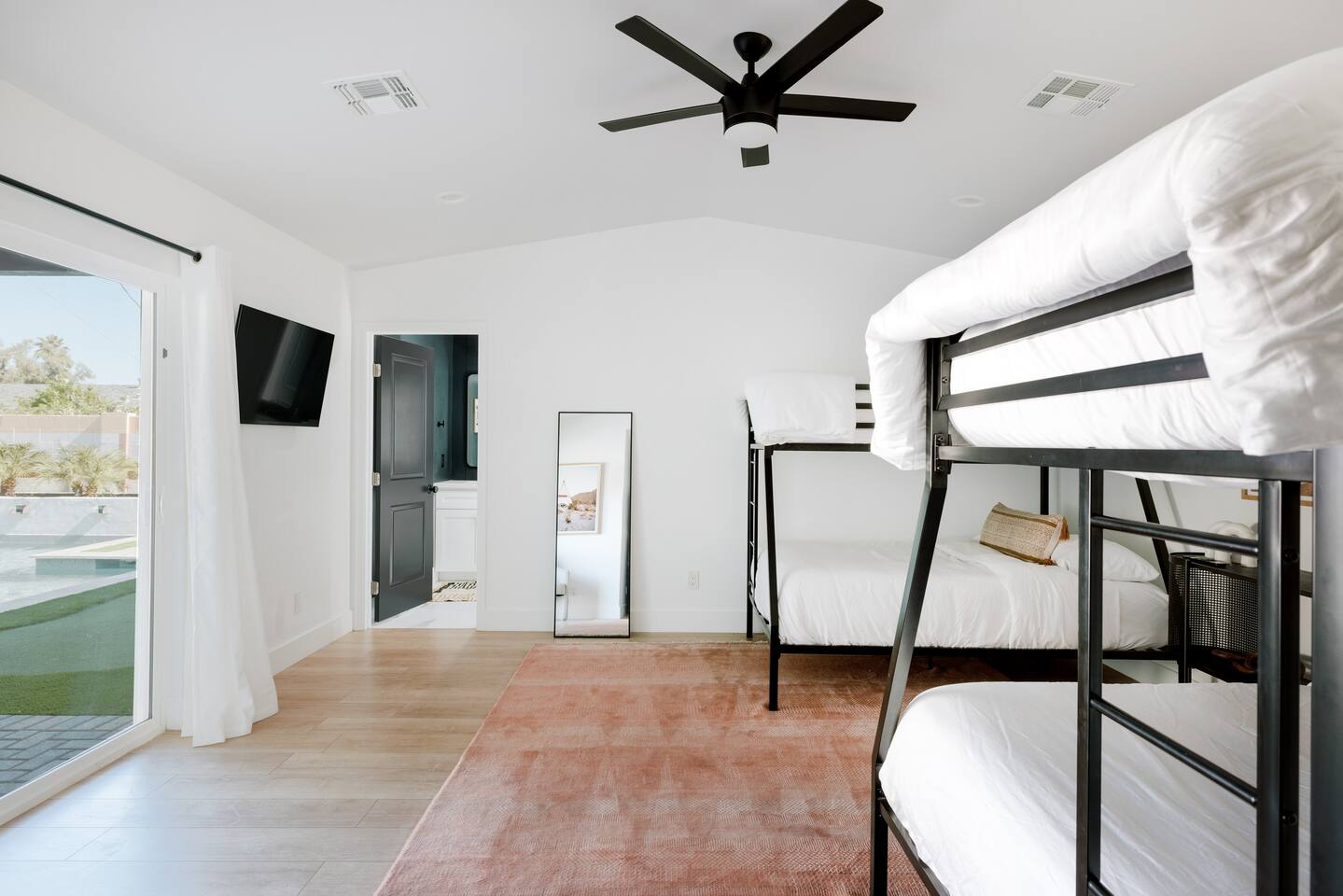 BACKYARD OASIS - Heated Pool (additional fee) with waterfall - Gas fire pit with lounge chairs - Putting green - Cornhole + Foosball - Gas grill, propane provided - Outdoor dining table seats 8 - Outdoor sofa seats 3, plus 2 additional chairs BEDROOMS: Bedroom 1: King bed, ensuite bath, full-length mirror Bedroom 2: Queen bed, full length mirror, dresser Bedroom 3: 2 twin beds, dresser Bedroom 4: 2 twin over full bunkbeds, ensuite bath, full length mirror, SmartTV -> Each bedroom comes with ceiling fans, closets, soft sheets and blackout shutters. The bedrooms are down a hallway, primary bedroom on the left with king, 2 bedrooms on the right (1 with queen, 1 with 2 twins), end of the hallway is the large bunk room. BATHROOMS - Primary Ensuite: single vanity, walk-in shower - Hall Bath: single vanity, shower/tub combo - Ensuite Bath in Bunkroom: double vanity, walk-in shower, water closet -> Each bathroom comes with towels, washcloths, hand towel, hair dryer, shampoo, conditioner, body wash, hand soap, TP, toilet spray KITCHEN - Large and fully stocked Chef's Kitchen! - Locally roasted coffee + tea bar, creamer, sweetener - Cuisinart drip coffee pot, teapot, toaster, blender - Pots, pans, baking dishes and sheets - Storage containers for leftovers - Drinking + wine glasses - Microwave - Electric range - Dishwasher with detergent to start - New fridge with ice maker and filtered water - Island seats 4 - Hand soap and dish soap provided - Spices and olive oil to start DINING - Dining table seats 10 - Island seats 4 - Outdoor table under the covered patio seats 8 ENTERTAINMENT - WIFI speeds up to 500 Mbps - SmartTV: Living room + Primary Bedroom - Use your own login to access a variety of streaming apps - No live TV at this time, unless you have your own login POOL - Private cocktail pool: pool depth 1.5' to 3.5' deep - Pool Heat: $65/night or $400/week, Oct–Apr - Baja shelf (1.5' deep) - Bubblers & waterfall feature - 2 pool side loungers - Electric air pump for your pool floats! - Pool towels provided *Please note: while the property is fenced in, the pool does not have a dedicated fence LAUNDRY - Top load washer + dryer - Laundry detergent, stain remover and dryer sheets provided - Iron, ironing board and steamer