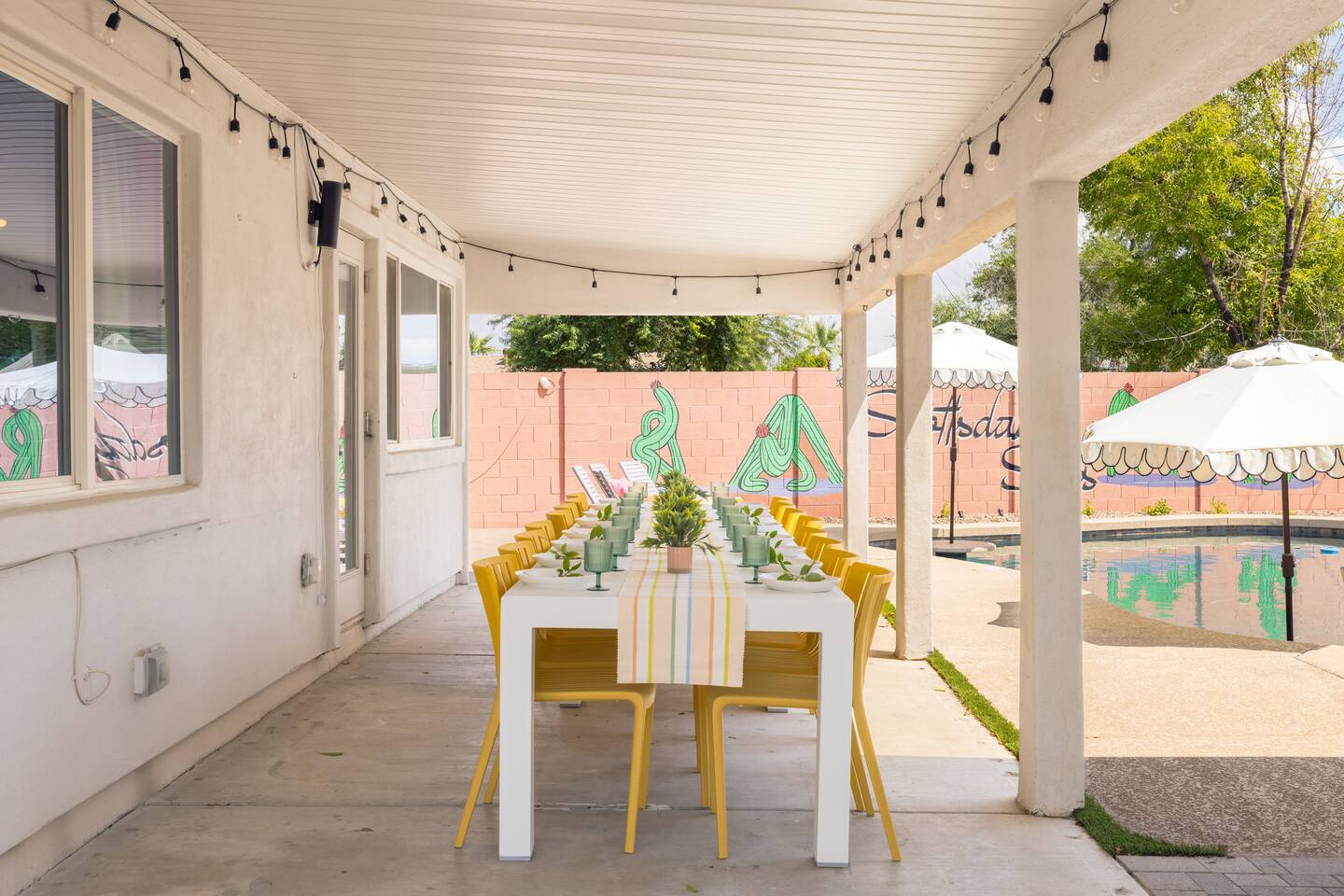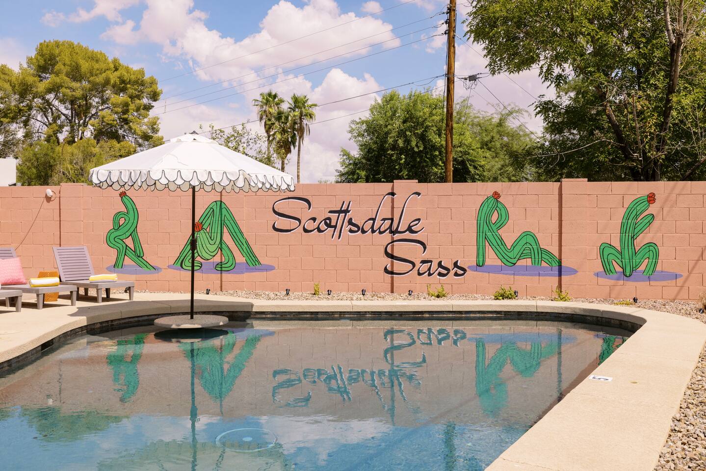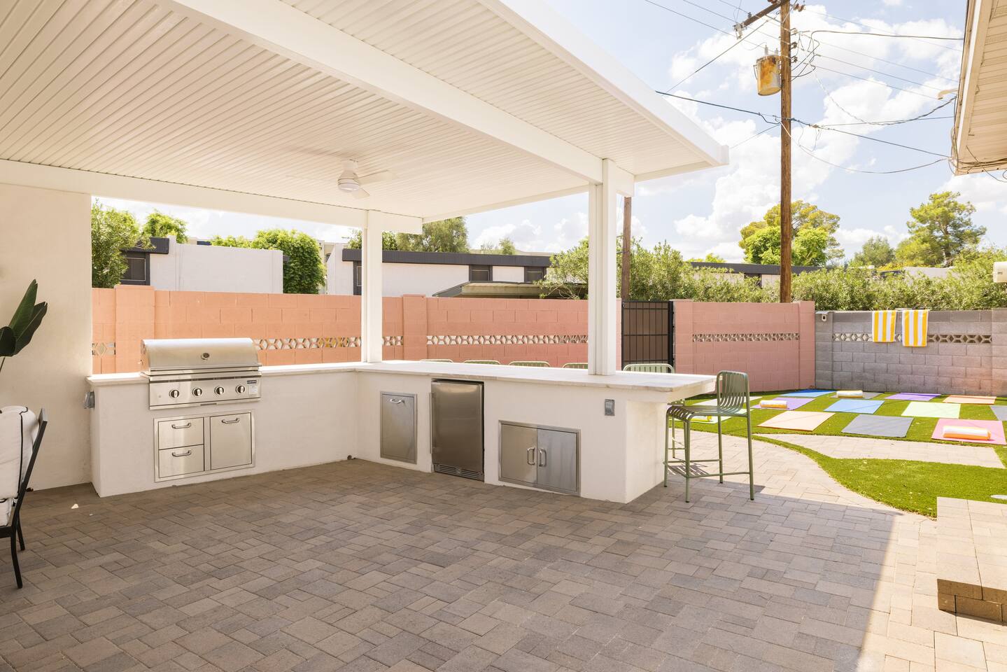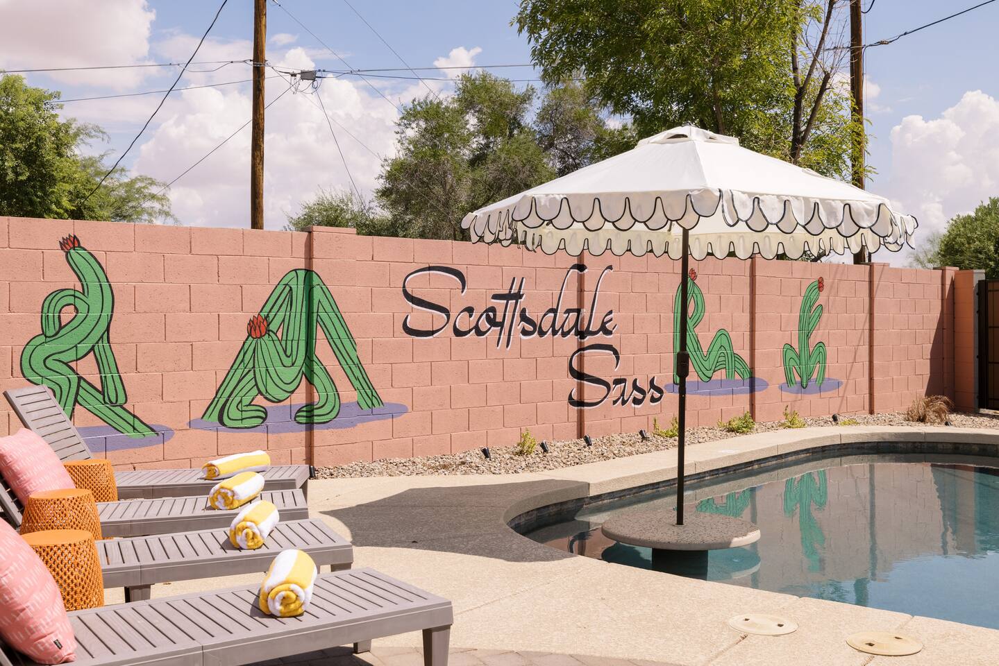Welcome to your vibrant and stylish Scottsdale retreat, perfectly designed for unforgettable group getaways! Just 2 miles from the heart of Old Town, this home is your private oasis for fun, relaxation, and making memories. BACKYARD OASIS: Step outside into your personal resort. The backyard is a true social hub, centered around a sparkling heated pool and a relaxing hot tub. Fire up the grill in the covered outdoor kitchen, complete with a beverage fridge and bar seating. As evening arrives, gather in the covered lounge to watch a movie on the Smart TV by the warmth of the outdoor fireplace. The spacious yard is perfect for morning yoga (mats provided!) or lawn games. - Covered Outdoor Kitchen: grill, beverage fridge, bar seating - Heated pool, heating optional Oct-April - Hot tub - Covered Outdoor dining for 16 - Fireplace and Smart TV - Yard for Yoga or games, mats provided! INSIDE The fun continues! Get ready for a night out in the unique 'glam bar' area, or challenge friends to some games. The living room features a large Smart TV and high-speed WiFi, perfect for streaming your favorite shows and movies after a day of exploring Scottsdale. BEDROOMS Five comfortable bedrooms provide restful spaces for everyone in your group. Bedroom 1: King bed, 1 Queen pullout Bedroom 2: Queen over Queen bunk Bedroom 3: 1 Queen Bedroom 4: Queen over Queen bunk Bedroom 5: 1 Queen BATHROOMS All bathrooms are stocked with plush towels, washcloths, hand towel, hair dryer, shampoo, conditioner, body wash, hand soap, TP, toilet spray. - Primary Bath Ensuite: double vanity, walk-in shower - Second Bath: single vanity, walk-in shower - Third Bath: double vanity, walk-in shower KITCHEN Prepare delicious meals in the large, fully stocked Chef's Kitchen. It’s equipped with everything you need, from a locally roasted coffee and tea bar to start your day, to all the pots, pans, and dishes for a group feast. The peninsula offers extra seating for casual bites, while the main dining table seats six. - Large and fully stocked Chef's Kitchen! - Locally roasted coffee + tea bar, creamer, sweetener - Coffee pot, teapot, toaster, blender - Pots, pans, baking dishes and sheets - Storage containers for leftovers - Drinking + wine glasses - Microwave - Electric range - Dishwasher with detergent - Fridge with ice maker and filtered water - Peninsula seating - Hand soap and dish soap provided - Salt, pepper, olive oil to start DINING - Dining table seats 6 ENTERTAINMENT - High Speed WIFI - SmartTV: Living room + Primary Bedroom - Use your own login to access a variety of streaming apps - No live TV at this time, unless you have your own login POOL + HOT TUB - Private heated pool - Pool Heat: $65/night or $400/week, Oct–Apr - Hot tub included - Pool side loungers - Electric air pump for your pool floats - Pool towels provided *please note: while the property is fenced in, the pool does not have a dedicated fence LAUNDRY - Laundry detergent, stain remover and dryer sheets provided - Iron, ironing board and steamer PARKING Located in a quiet cul-de-sac, we only have parking available for 3 average sized cars as there is no street parking permitted. Uber or Waymo (self driving taxis!) are a great option!