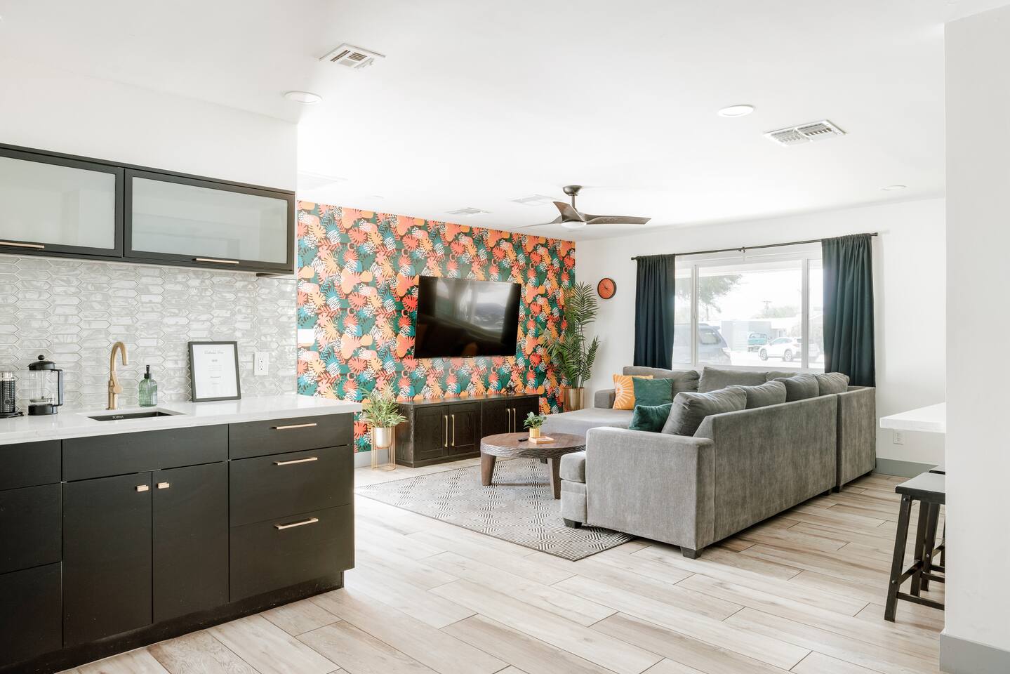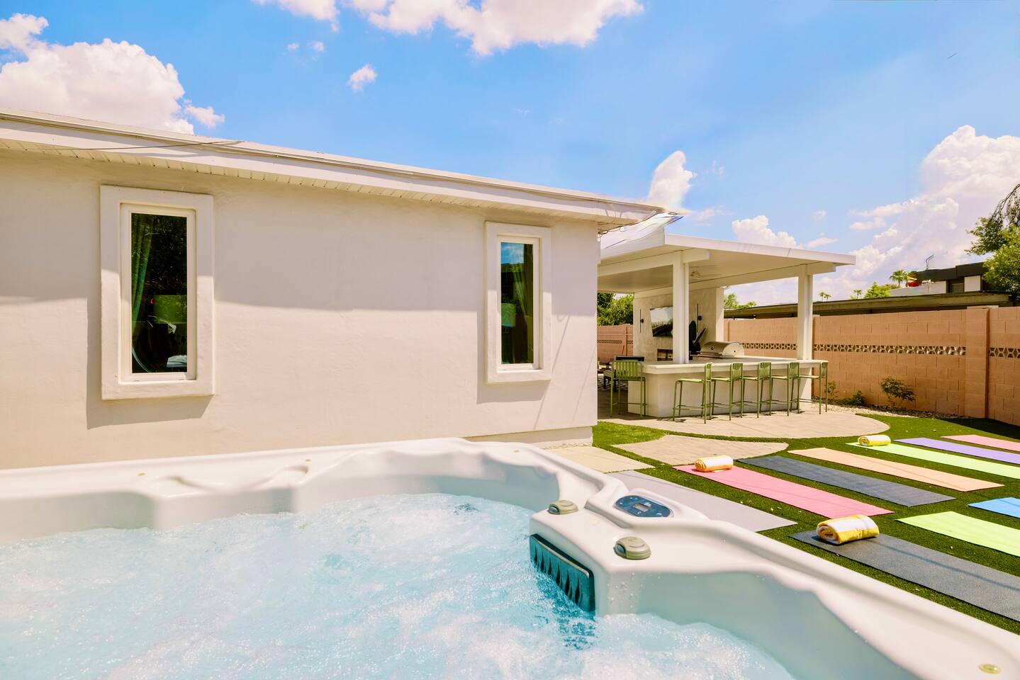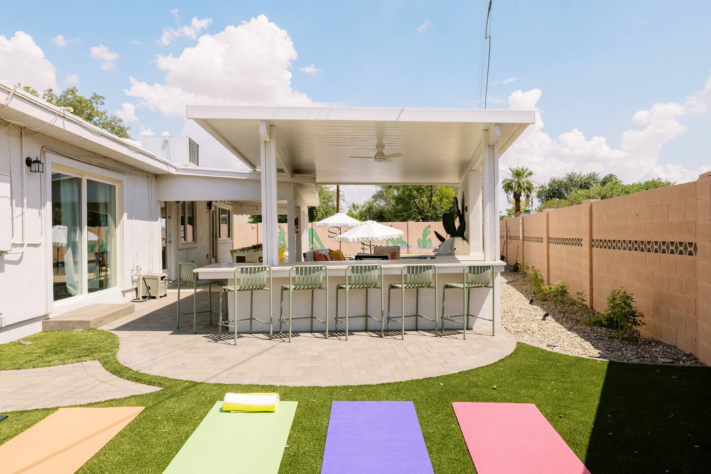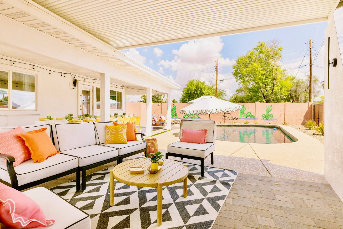 Welcome to your vibrant and stylish Scottsdale retreat, perfectly designed for unforgettable group getaways! Just 2 miles from the heart of Old Town, this home is your private oasis for fun, relaxation, and making memories. BACKYARD OASIS: Step outside into your personal resort. The backyard is a true social hub, centered around a sparkling heated pool and a relaxing hot tub. Fire up the grill in the covered outdoor kitchen, complete with a beverage fridge and bar seating. As evening arrives, gather in the covered lounge to watch a movie on the Smart TV by the warmth of the outdoor fireplace. The spacious yard is perfect for morning yoga (mats provided!) or lawn games. - Covered Outdoor Kitchen: grill, beverage fridge, bar seating - Heated pool, heating optional Oct-April - Hot tub - Covered Outdoor dining for 16 - Fireplace and Smart TV - Yard for Yoga or games, mats provided! INSIDE The fun continues! Get ready for a night out in the unique 'glam bar' area, or challenge friends to some games. The living room features a large Smart TV and high-speed WiFi, perfect for streaming your favorite shows and movies after a day of exploring Scottsdale. BEDROOMS Five comfortable bedrooms provide restful spaces for everyone in your group. Bedroom 1: King bed, 1 Queen pullout Bedroom 2: Queen over Queen bunk Bedroom 3: 1 Queen Bedroom 4: Queen over Queen bunk Bedroom 5: 1 Queen BATHROOMS All bathrooms are stocked with plush towels, washcloths, hand towel, hair dryer, shampoo, conditioner, body wash, hand soap, TP, toilet spray. - Primary Bath Ensuite: double vanity, walk-in shower - Second Bath: single vanity, walk-in shower - Third Bath: double vanity, walk-in shower KITCHEN Prepare delicious meals in the large, fully stocked Chef's Kitchen. It’s equipped with everything you need, from a locally roasted coffee and tea bar to start your day, to all the pots, pans, and dishes for a group feast. The peninsula offers extra seating for casual bites, while the main dining table seats six. - Large and fully stocked Chef's Kitchen! - Locally roasted coffee + tea bar, creamer, sweetener - Coffee pot, teapot, toaster, blender - Pots, pans, baking dishes and sheets - Storage containers for leftovers - Drinking + wine glasses - Microwave - Electric range - Dishwasher with detergent - Fridge with ice maker and filtered water - Peninsula seating - Hand soap and dish soap provided - Salt, pepper, olive oil to start DINING - Dining table seats 6 ENTERTAINMENT - High Speed WIFI - SmartTV: Living room + Primary Bedroom - Use your own login to access a variety of streaming apps - No live TV at this time, unless you have your own login POOL + HOT TUB - Private heated pool - Pool Heat: $65/night or $400/week, Oct–Apr - Hot tub included - Pool side loungers - Electric air pump for your pool floats - Pool towels provided *please note: while the property is fenced in, the pool does not have a dedicated fence LAUNDRY - Laundry detergent, stain remover and dryer sheets provided - Iron, ironing board and steamer PARKING Located in a quiet cul-de-sac, we only have parking available for 3 average sized cars as there is no street parking permitted. Uber or Waymo (self driving taxis!) are a great option!