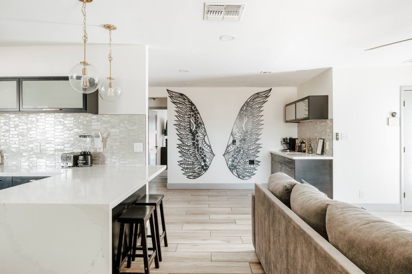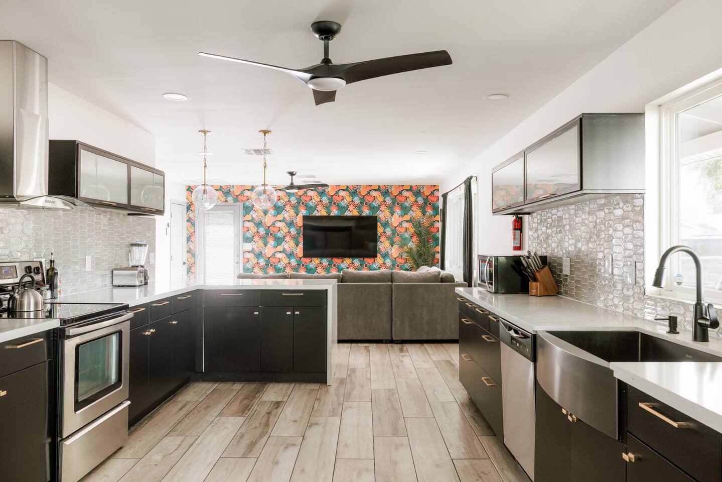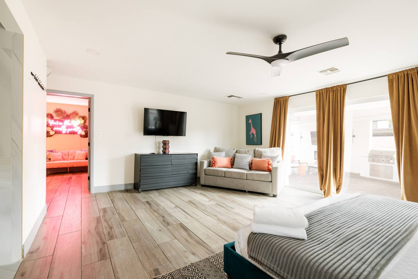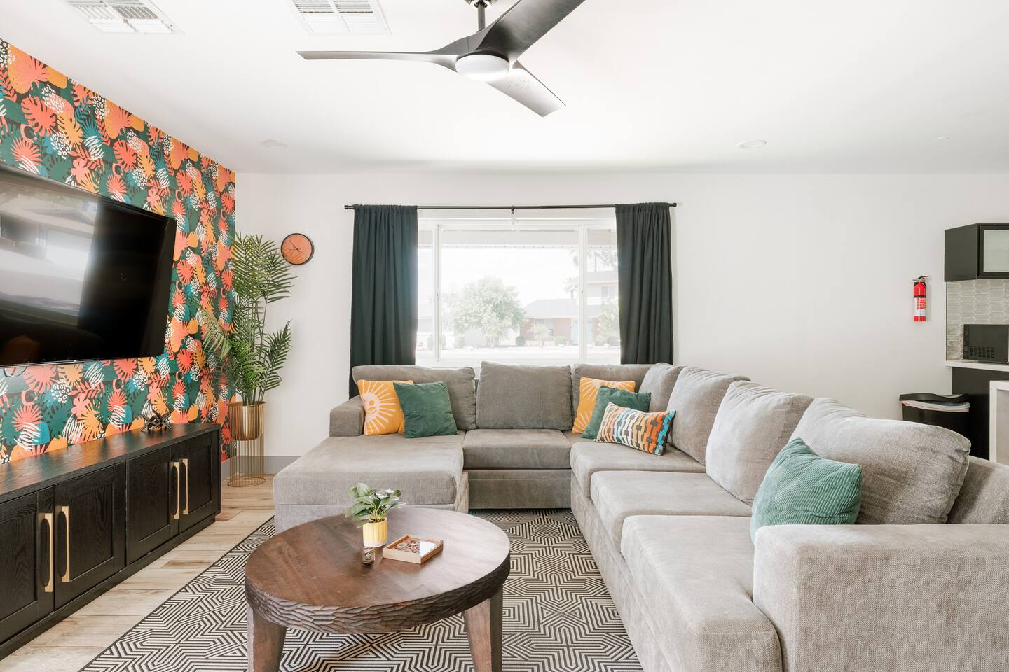 Welcome to your vibrant and stylish Scottsdale retreat, perfectly designed for unforgettable group getaways! Just 2 miles from the heart of Old Town, this home is your private oasis for fun, relaxation, and making memories. BACKYARD OASIS: Step outside into your personal resort. The backyard is a true social hub, centered around a sparkling heated pool and a relaxing hot tub. Fire up the grill in the covered outdoor kitchen, complete with a beverage fridge and bar seating. As evening arrives, gather in the covered lounge to watch a movie on the Smart TV by the warmth of the outdoor fireplace. The spacious yard is perfect for morning yoga (mats provided!) or lawn games. - Covered Outdoor Kitchen: grill, beverage fridge, bar seating - Heated pool, heating optional Oct-April - Hot tub - Covered Outdoor dining for 16 - Fireplace and Smart TV - Yard for Yoga or games, mats provided! INSIDE The fun continues! Get ready for a night out in the unique 'glam bar' area, or challenge friends to some games. The living room features a large Smart TV and high-speed WiFi, perfect for streaming your favorite shows and movies after a day of exploring Scottsdale. BEDROOMS Five comfortable bedrooms provide restful spaces for everyone in your group. Bedroom 1: King bed, 1 Queen pullout Bedroom 2: Queen over Queen bunk Bedroom 3: 1 Queen Bedroom 4: Queen over Queen bunk Bedroom 5: 1 Queen BATHROOMS All bathrooms are stocked with plush towels, washcloths, hand towel, hair dryer, shampoo, conditioner, body wash, hand soap, TP, toilet spray. - Primary Bath Ensuite: double vanity, walk-in shower - Second Bath: single vanity, walk-in shower - Third Bath: double vanity, walk-in shower KITCHEN Prepare delicious meals in the large, fully stocked Chef's Kitchen. It’s equipped with everything you need, from a locally roasted coffee and tea bar to start your day, to all the pots, pans, and dishes for a group feast. The peninsula offers extra seating for casual bites, while the main dining table seats six. - Large and fully stocked Chef's Kitchen! - Locally roasted coffee + tea bar, creamer, sweetener - Coffee pot, teapot, toaster, blender - Pots, pans, baking dishes and sheets - Storage containers for leftovers - Drinking + wine glasses - Microwave - Electric range - Dishwasher with detergent - Fridge with ice maker and filtered water - Peninsula seating - Hand soap and dish soap provided - Salt, pepper, olive oil to start DINING - Dining table seats 6 ENTERTAINMENT - High Speed WIFI - SmartTV: Living room + Primary Bedroom - Use your own login to access a variety of streaming apps - No live TV at this time, unless you have your own login POOL + HOT TUB - Private heated pool - Pool Heat: $65/night or $400/week, Oct–Apr - Hot tub included - Pool side loungers - Electric air pump for your pool floats - Pool towels provided *please note: while the property is fenced in, the pool does not have a dedicated fence LAUNDRY - Laundry detergent, stain remover and dryer sheets provided - Iron, ironing board and steamer PARKING Located in a quiet cul-de-sac, we only have parking available for 3 average sized cars as there is no street parking permitted. Uber or Waymo (self driving taxis!) are a great option!
