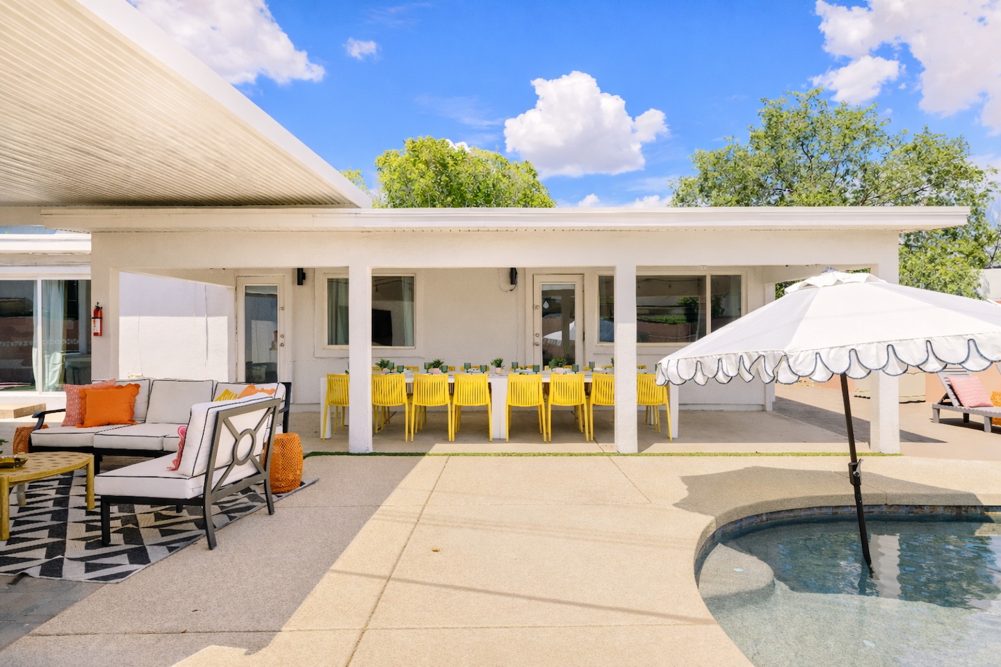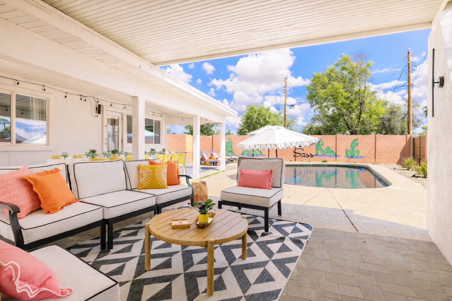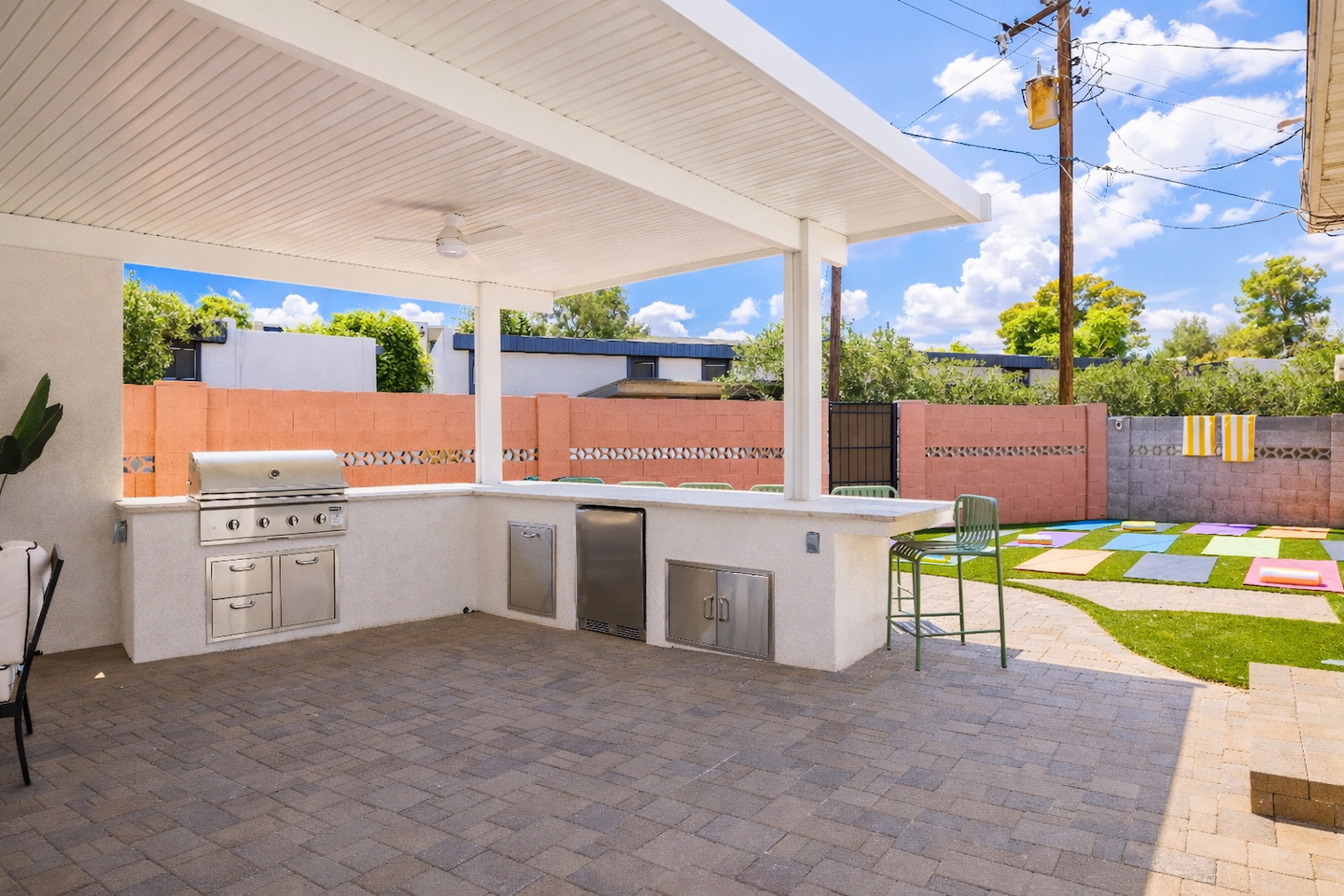 Welcome to your vibrant and stylish Scottsdale retreat, perfectly designed for unforgettable group getaways! Just 2 miles from the heart of Old Town, this home is your private oasis for fun, relaxation, and making memories. BACKYARD OASIS: Step outside into your personal resort. The backyard is a true social hub, centered around a sparkling heated pool and a relaxing hot tub. Fire up the grill in the covered outdoor kitchen, complete with a beverage fridge and bar seating. As evening arrives, gather in the covered lounge to watch a movie on the Smart TV by the warmth of the outdoor fireplace. The spacious yard is perfect for morning yoga (mats provided!) or lawn games. - Covered Outdoor Kitchen: grill, beverage fridge, bar seating - Heated pool, heating optional Oct-April - Hot tub - Covered Outdoor dining for 16 - Fireplace and Smart TV - Yard for Yoga or games, mats provided! INSIDE The fun continues! Get ready for a night out in the unique 'glam bar' area, or challenge friends to some games. The living room features a large Smart TV and high-speed WiFi, perfect for streaming your favorite shows and movies after a day of exploring Scottsdale. BEDROOMS Five comfortable bedrooms provide restful spaces for everyone in your group. Bedroom 1: King bed + Queen pullout Bedroom 2: Queen Bedroom 3: Queen Bedroom 4: Queen over Queen bunk Bedroom 5: Queen over Queen bunk BATHROOMS All bathrooms are stocked with plush towels, washcloths, hand towel, hair dryer, shampoo, conditioner, body wash, hand soap, TP, toilet spray. - Primary Bath Ensuite: double vanity, walk-in shower - Second Bath: single vanity, walk-in shower - Third Bath: double vanity, walk-in shower KITCHEN Prepare delicious meals in the large, fully stocked Chef's Kitchen. It’s equipped with everything you need, from a locally roasted coffee and tea bar to start your day, to all the pots, pans, and dishes for a group feast. The peninsula offers extra seating for casual bites, while the main dining table seats six. - Large and fully stocked Chef's Kitchen! - Locally roasted coffee + tea bar, creamer, sweetener - Coffee pot, teapot, toaster, blender - Pots, pans, baking dishes and sheets - Storage containers for leftovers - Drinking + wine glasses - Microwave - Electric range - Dishwasher with detergent - Fridge with ice maker and filtered water - Peninsula seating - Hand soap and dish soap provided - Salt, pepper, olive oil to start DINING - Dining table seats 6 ENTERTAINMENT - High Speed WIFI - SmartTV: Living room + Primary Bedroom - Use your own login to access a variety of streaming apps - No live TV at this time, unless you have your own login POOL + HOT TUB - Private heated pool - Pool Heat: $65/night USD or $400/week USD, Oct–Apr - Hot tub included - Pool side loungers - Electric air pump for your pool floats - Pool towels provided *please note: while the property is fenced in, the pool does not have a dedicated fence LAUNDRY - Laundry detergent, stain remover and dryer sheets provided - Iron, ironing board and steamer PARKING Located in a quiet cul-de-sac, we only have parking available for 3 average sized cars as there is no street parking permitted. Uber or Waymo (self driving taxis!) are a great option!