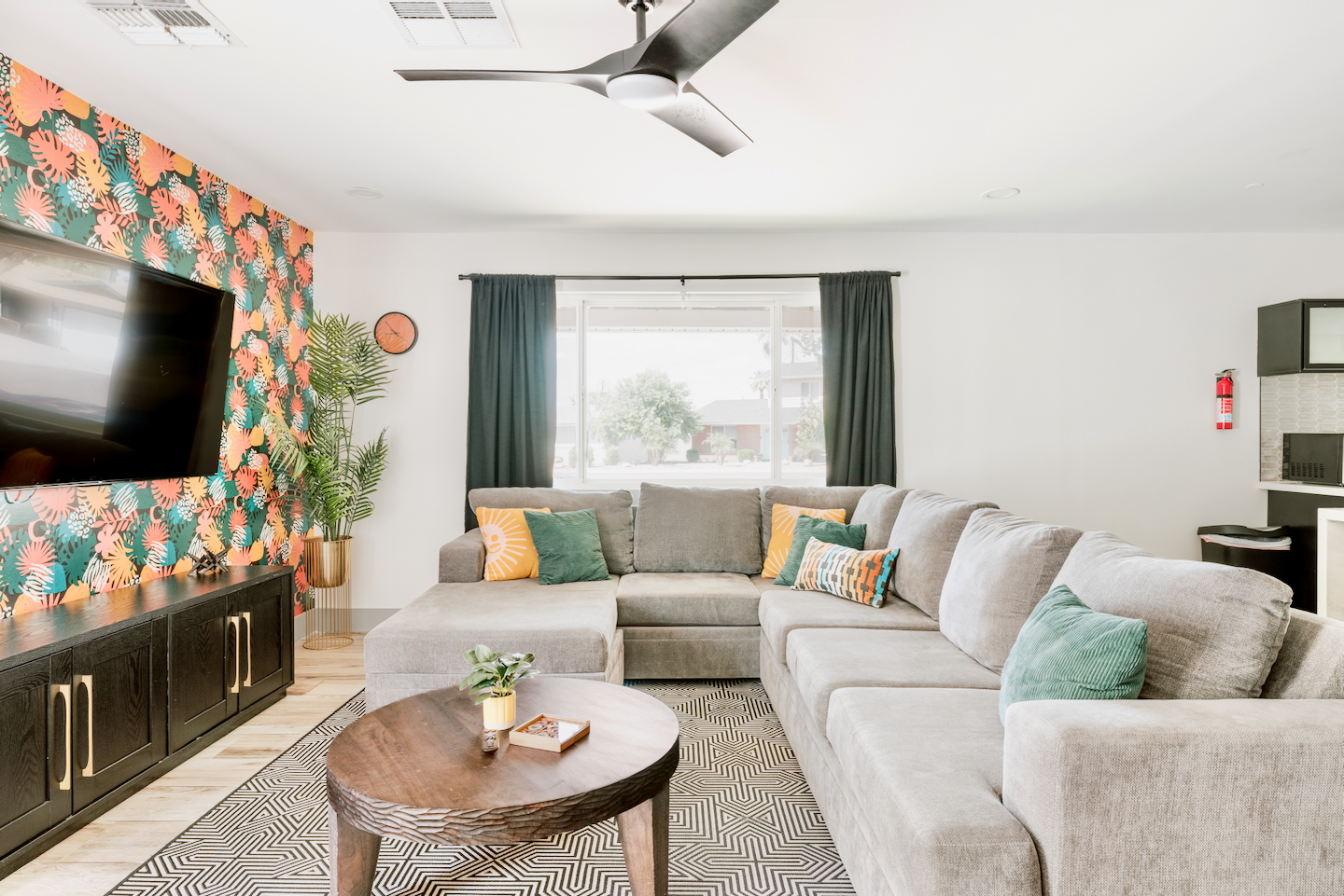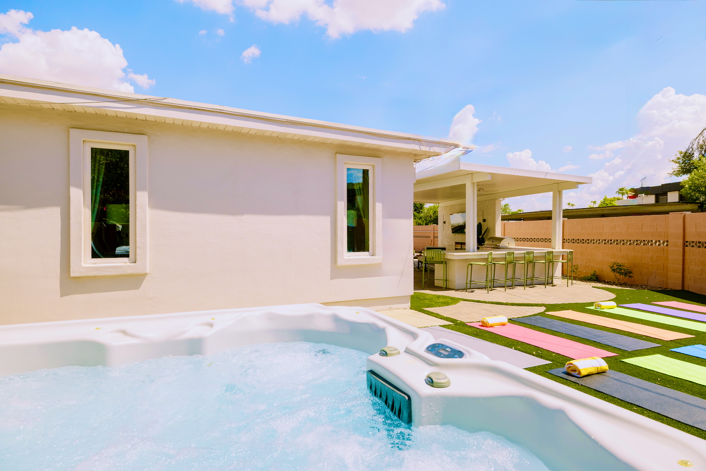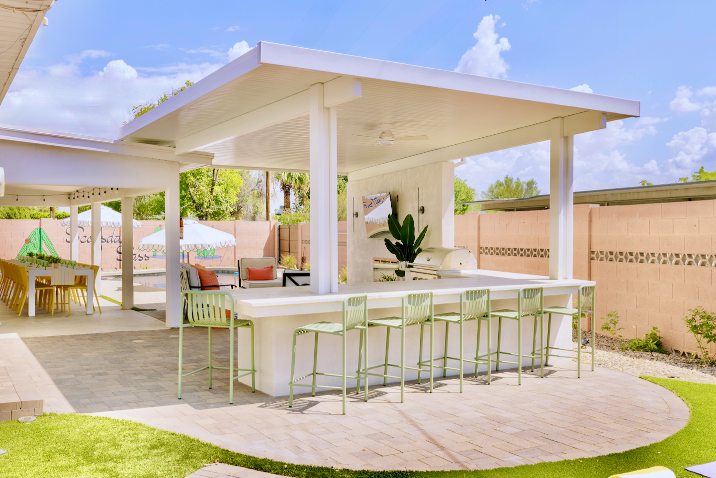 Welcome to your vibrant and stylish Scottsdale retreat, perfectly designed for unforgettable group getaways! Just 2 miles from the heart of Old Town, this home is your private oasis for fun, relaxation, and making memories. BACKYARD OASIS: Step outside into your personal resort. The backyard is a true social hub, centered around a sparkling heated pool and a relaxing hot tub. Fire up the grill in the covered outdoor kitchen, complete with a beverage fridge and bar seating. As evening arrives, gather in the covered lounge to watch a movie on the Smart TV by the warmth of the outdoor fireplace. The spacious yard is perfect for morning yoga (mats provided!) or lawn games. - Covered Outdoor Kitchen: grill, beverage fridge, bar seating - Heated pool, heating optional Oct-April - Hot tub - Covered Outdoor dining for 16 - Fireplace and Smart TV - Yard for Yoga or games, mats provided! INSIDE The fun continues! Get ready for a night out in the unique 'glam bar' area, or challenge friends to some games. The living room features a large Smart TV and high-speed WiFi, perfect for streaming your favorite shows and movies after a day of exploring Scottsdale. BEDROOMS Five comfortable bedrooms provide restful spaces for everyone in your group. Bedroom 1: King bed + Queen pullout Bedroom 2: Queen Bedroom 3: Queen Bedroom 4: Queen over Queen bunk Bedroom 5: Queen over Queen bunk BATHROOMS All bathrooms are stocked with plush towels, washcloths, hand towel, hair dryer, shampoo, conditioner, body wash, hand soap, TP, toilet spray. - Primary Bath Ensuite: double vanity, walk-in shower - Second Bath: single vanity, walk-in shower - Third Bath: double vanity, walk-in shower KITCHEN Prepare delicious meals in the large, fully stocked Chef's Kitchen. It’s equipped with everything you need, from a locally roasted coffee and tea bar to start your day, to all the pots, pans, and dishes for a group feast. The peninsula offers extra seating for casual bites, while the main dining table seats six. - Large and fully stocked Chef's Kitchen! - Locally roasted coffee + tea bar, creamer, sweetener - Coffee pot, teapot, toaster, blender - Pots, pans, baking dishes and sheets - Storage containers for leftovers - Drinking + wine glasses - Microwave - Electric range - Dishwasher with detergent - Fridge with ice maker and filtered water - Peninsula seating - Hand soap and dish soap provided - Salt, pepper, olive oil to start DINING - Dining table seats 6 ENTERTAINMENT - High Speed WIFI - SmartTV: Living room + Primary Bedroom - Use your own login to access a variety of streaming apps - No live TV at this time, unless you have your own login POOL + HOT TUB - Private heated pool - Pool Heat: $65/night USD or $400/week USD, Oct–Apr - Hot tub included - Pool side loungers - Electric air pump for your pool floats - Pool towels provided *please note: while the property is fenced in, the pool does not have a dedicated fence LAUNDRY - Laundry detergent, stain remover and dryer sheets provided - Iron, ironing board and steamer PARKING Located in a quiet cul-de-sac, we only have parking available for 3 average sized cars as there is no street parking permitted. Uber or Waymo (self driving taxis!) are a great option!