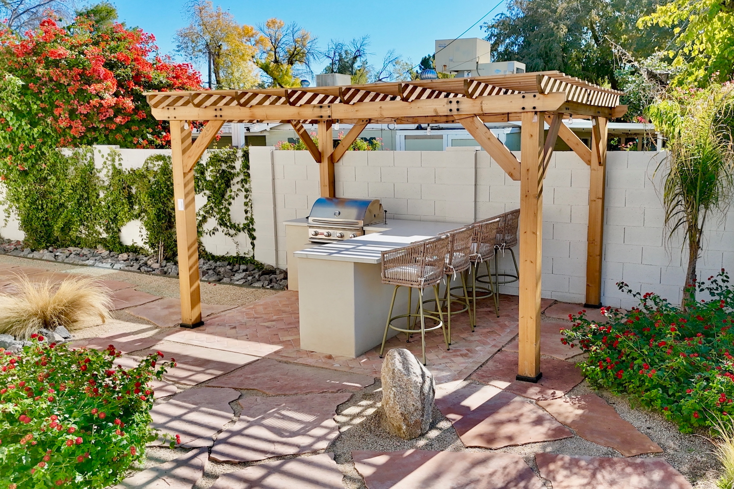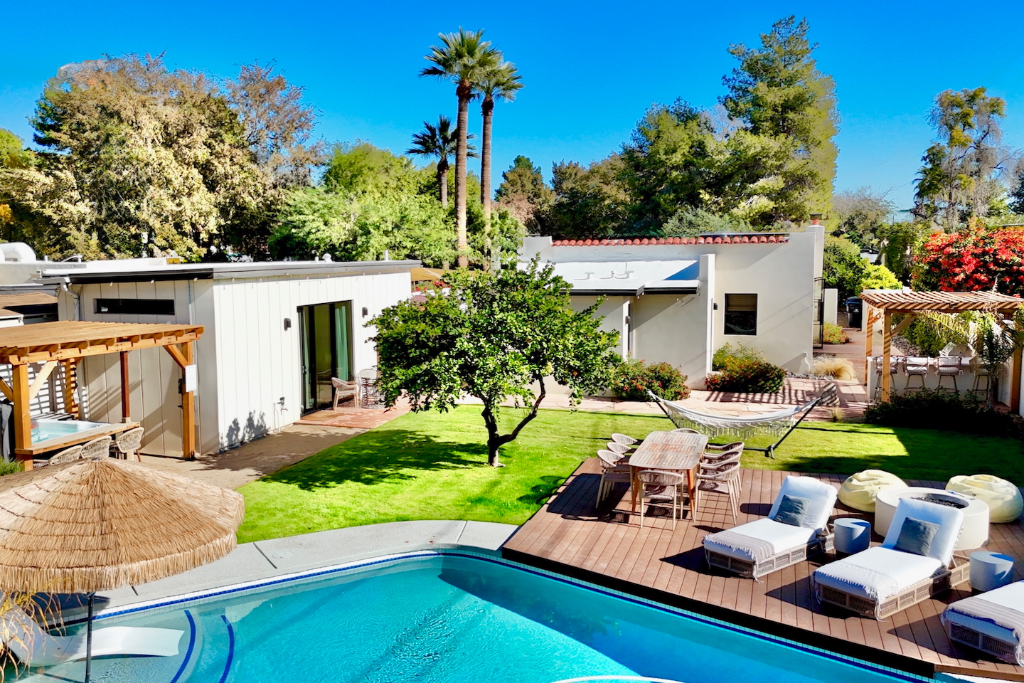 Welcome to Solera Wellness Retreat — a serene adobe escape in the heart of Phoenix. This peaceful desert oasis features a private heated pool, sauna, spa, hammock swings, and a tranquil outdoor lounge perfect for unwinding. With a separate casita, gourmet kitchen, and optional concierge touches, it's the ideal retreat for relaxation and recharge. BACKYARD RETREAT AMENITIES - Full backyard hydrotherapy circuit (sauna ➝ cold plunge ➝ hot tub ➝ heated pool) - Outdoor Kitchen: grill, mini fridge, bar stools - Heated pool, additional fee - Hot tub that seats 6 - Cold plunge - Infrared sauna + Steam sauna - Natural Gas Fire Pit - Outdoor dining, seating for 6-8 - Cafe table, seating for 2 - Yard area for yoga - Hammock + Hammock swings BEDROOMS: - Primary: Queen bed, Ensuite Bath, 40" SmartTV, Closet - Bedroom 2: 2 Twins or combine for a King, Ensuite Bath, 48" SmartTV, Desk - Bedroom 3: Full bed, 32" SmartTV - Bedroom 4 (Casita): 2 Twins or combine for a King + Queen, bed, Ensuite Bath, Kitchenette, 32" SmartTV -> Each bedroom comes with room darkening shades, ceiling fan, closet or clothing rack BATHROOMS: Primary Ensuite: single vanity, walk-in shower Secondary Ensuite: double vanity, walk-in shower Hall Bathroom: single vanity, tub/shower combo Casita Bathroom: single vanity, walk-in shower -> Each bathroom comes with towels, washcloths, hand towel, hair dryer, shampoo, conditioner, body wash, hand soap, TP, toilet spray KITCHEN - Nespresso Original + pods - Cuisinart Drip, organic locally roasted ground coffee - Coffee bar: creamer, sugar, tea - Cafe Fridge: Filtered water + Ice maker - Cafe Dishwasher - Cafe Gas Range - Microwave - Pots and pans, baking dishes, containers for leftovers - Drinking glasses, salad/mixing bowls - Knives - Servery Breakfast bar w/sliding door that opens to front patio DINING - Indoor Dining Table seating for 6 - Servery Breakfast Bar seating for 4 - Outdoor Kitchen seating for 4 - Outdoor Dining Table seating for 8 - Outdoor Cafe Table seating for 2 LIVING ROOM - Gas Fireplace - SmartTV POOL + HOT TUB - Heated Pool, additional daily rate - Pool Heat: $65/night USD or $400/week USD, Oct–Apr - Hot tub included - Baja Shelf + sun loungers + umbrella - Pool deck patio loungers - Electric air pump for your pool floats! - Pool towels provided ENTERTAINMENT: - Living Room, Primary and Second Bedroom SmartTVs - Use your own login to access a variety of streaming apps. - WiFi internet connection LAUNDRY - Washer - Dryer - Laundry detergent, bleach and dryer sheets provided. PARKING - We can accommodate up to 4 regular sized cars.