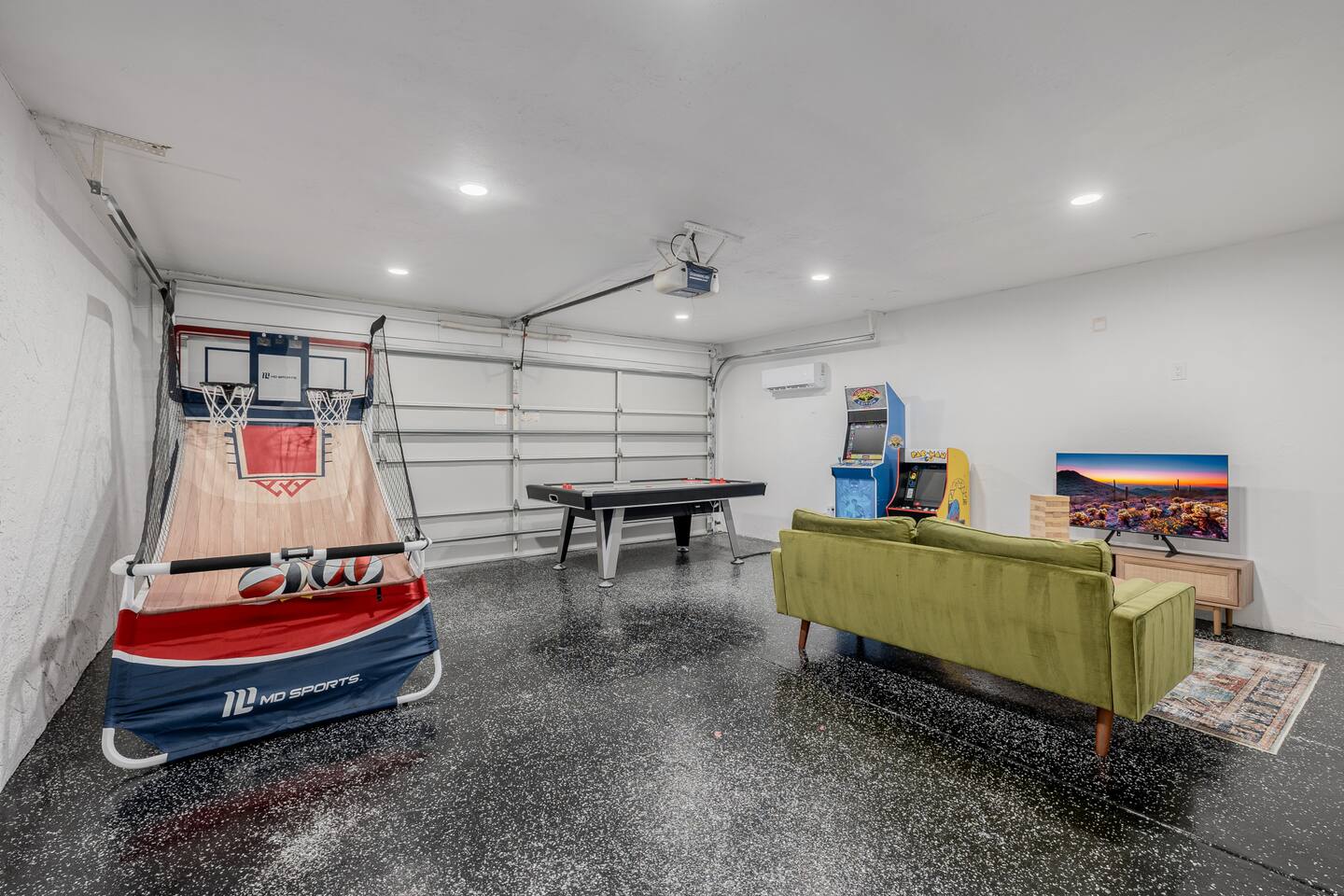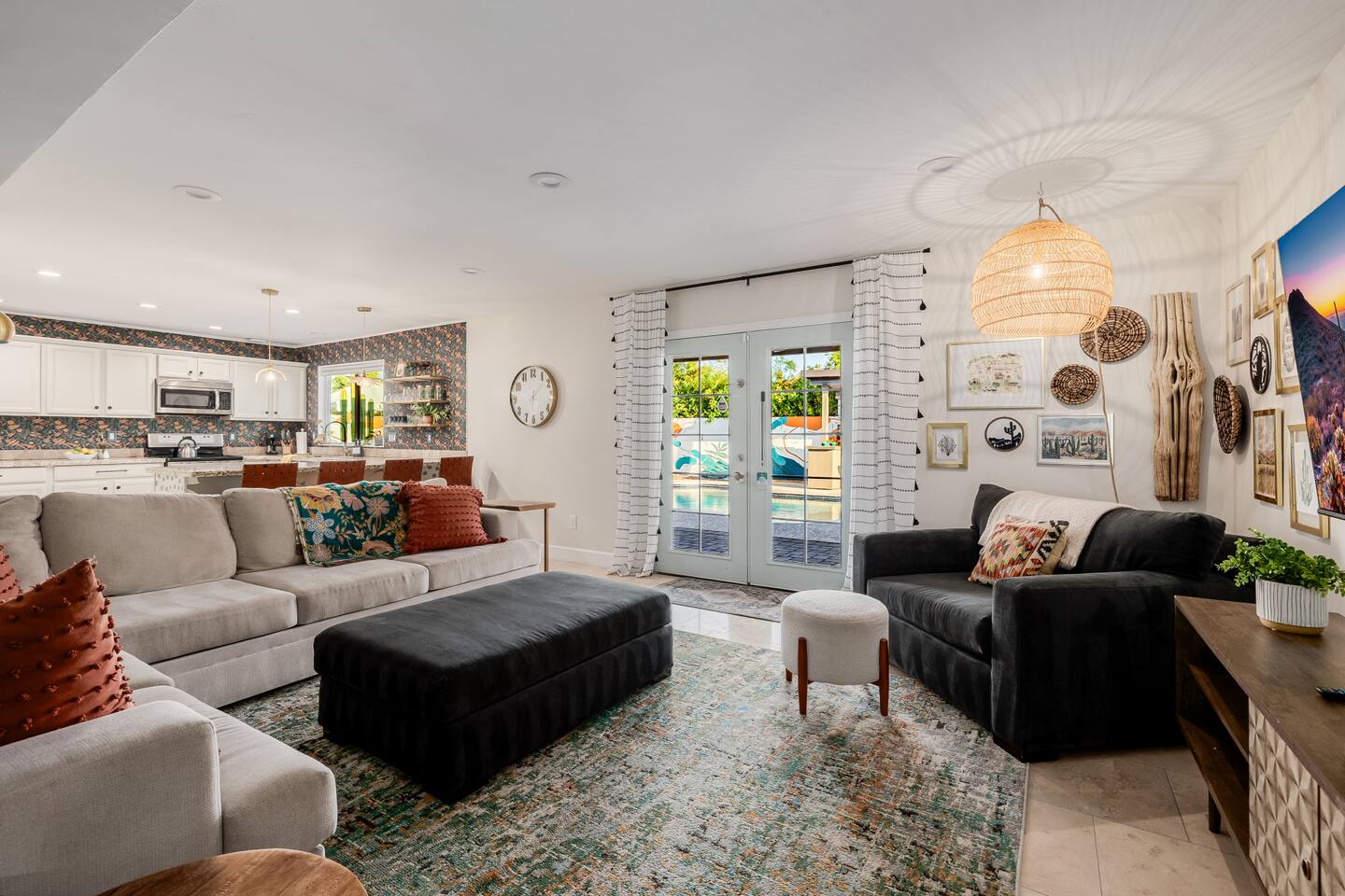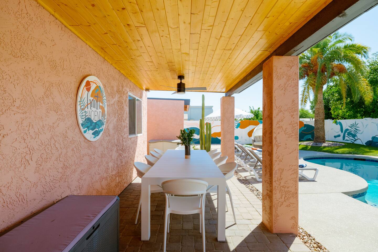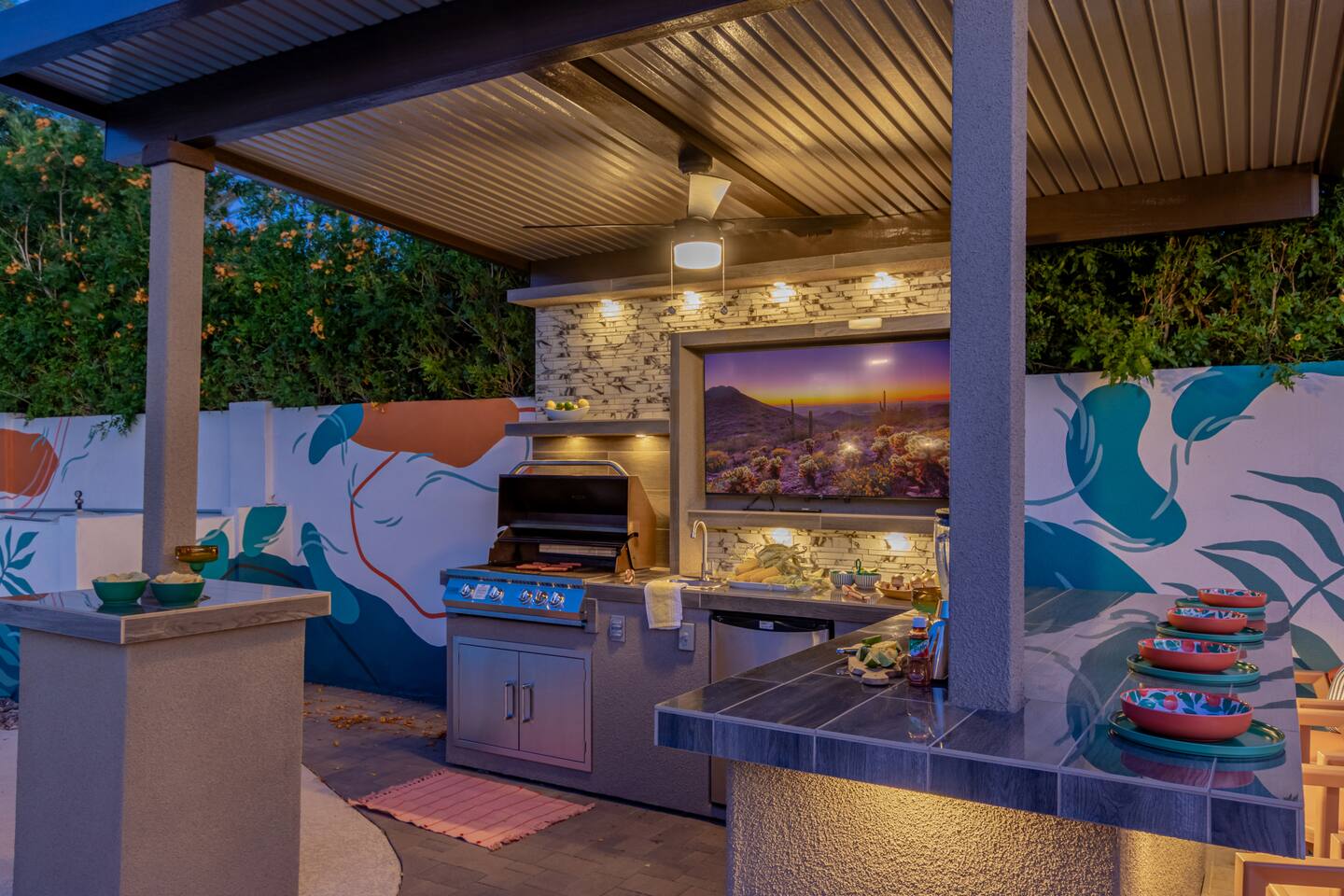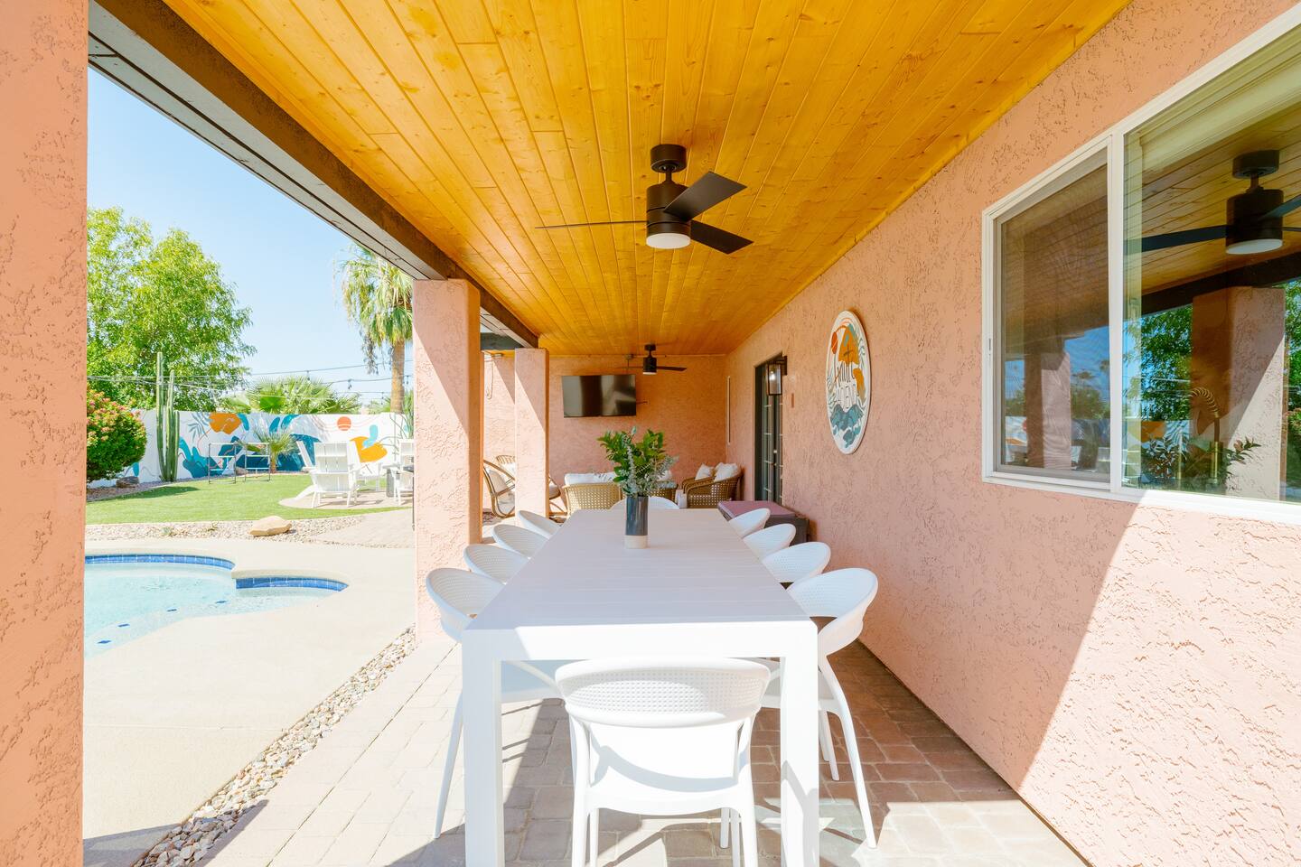 Escape to Sonoran Soul, a luxury North Scottsdale retreat just 5 minutes from Kierland Commons and Scottsdale Quarter. Perfect for families, groups, golf trips, and bachelorette getaways, this 4-bed, 2-bath home sleeps up to 12 and delivers the full resort experience—8' deep private heated pool, hot tub, putting green, fire pit, outdoor kitchen, Smart TVs everywhere, and a garage game room loaded with air hockey, arcade games, darts, and more. Inside, unwind in stylish living spaces, a fully stocked chef’s kitchen, and comfortable bedrooms with blackout shades and bamboo linens. Fast Wi-Fi, multiple workspaces, and top-tier Mostess hosting round out a stay built for effortless fun in one of Scottsdale’s most desirable neighborhoods. Outdoor Oasis: - Private 8' deep pool (heating available) - Hot tub for relaxing evenings - 3-hole putting green and cornhole boards - Outdoor kitchen with grill and bar seating - Fire pit with cozy seating area - Covered patio with dining for 8 and outdoor Smart TV Bedrooms: - Primary: King bed with ensuite bathroom - Bedroom 2: Queen bed - Bedroom 3: Two twin bunk beds - Bedroom 4: Two queen beds - Bamboo sheets, fans, blackout shades/curtains Bathrooms: - 2 full baths, one stand up shower (primary), one shower/tub combo - Shampoo, conditioner, body/hand soap - Fluffy towels and hair dryers provided Indoor Comforts: - Stocked chef's kitchen with modern appliances - Spacious living areas with Smart TVs - Garage game room featuring air hockey, arcade games, and more - High-speed Wi-Fi and dedicated workspace - Washer and dryer with provided essentials - Nespresso, Keurig, drip, coffee press, tea bar - Fully stocked kitchen: InstantPot, blender Dining: - Dining table that seats 6 - Bar stools at counter seat 4 - Outdoor dining seats 6 Entertainment: - 5 Smart TVs: both living rooms, primary bedroom, bunk room, outside - Log in to any app of your choice with your own login - High speed WIFI - Our dining table is a great place to get work done - Pac-Man arcade game Pool + Hot Tub - Private pool can be heated Oct 1 - April 30, additional daily fee - Pool Heat: $65/night or $400/week, Oct–Apr - Hot Tub always included - Pool pump for floats provided - 8 pool side lounge chairs, plus umbrellas - Pool towels provided Backyard: - Outdoor kitchen with grill, SmartTV, sink, fridge, bar seating - Fire pit + conversation seating area - Covered patio with dining table, seating for 10 - Covered Outdoor Smart TV Lounge - Yard games Garage Game Room - Air hockey - Pop-a-shot basketball hoop - Pacman Arcade game - Street Fighter II arcade game - Darts - Sofa with coffee table - TV Laundry - Washer and dryer in home - Laundry detergent, stain treatment and dryer sheets provided - Iron, ironing board, and steamer provided Parking: - Up to 4 vehicles - Parking Options: driveway, garage or on-street Mostess Hosts Professionally hosted by Mostess, a boutique Arizona vacation rental brand known for elevated experiences and top-tier communication — without the dreaded checkout chore list. Designed by influencer @hautehouselove!