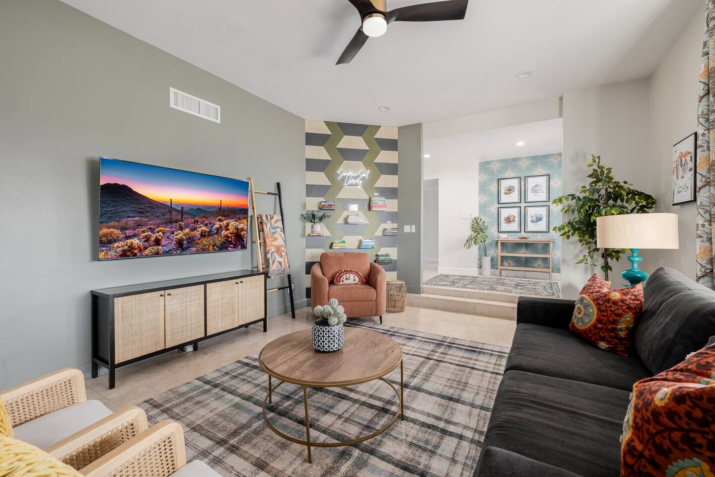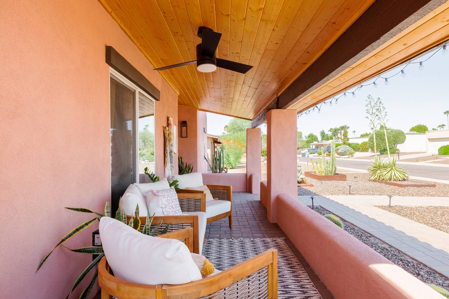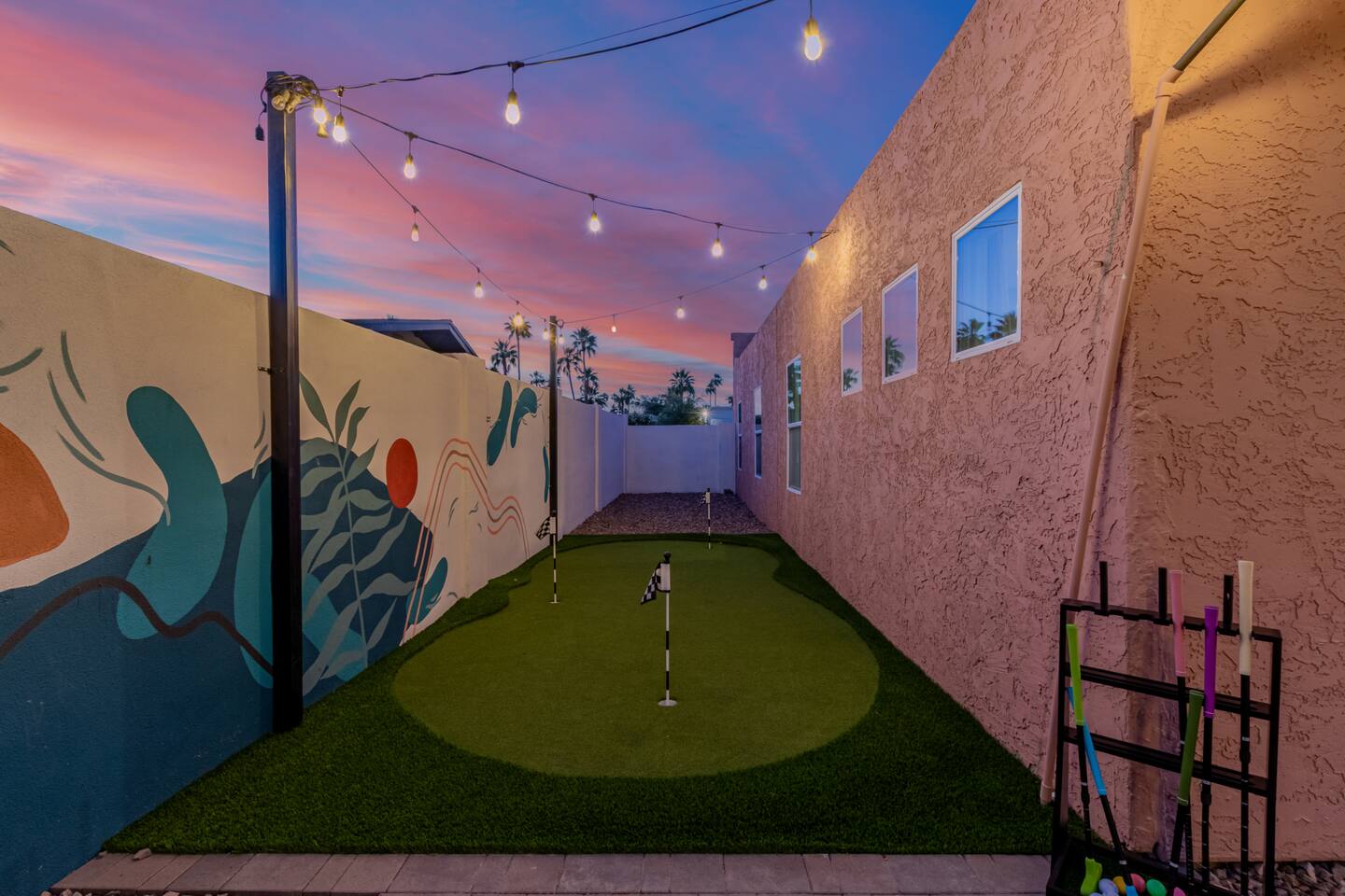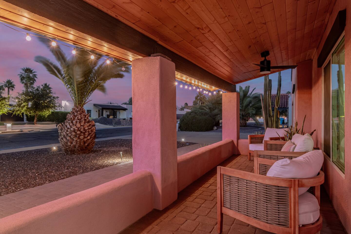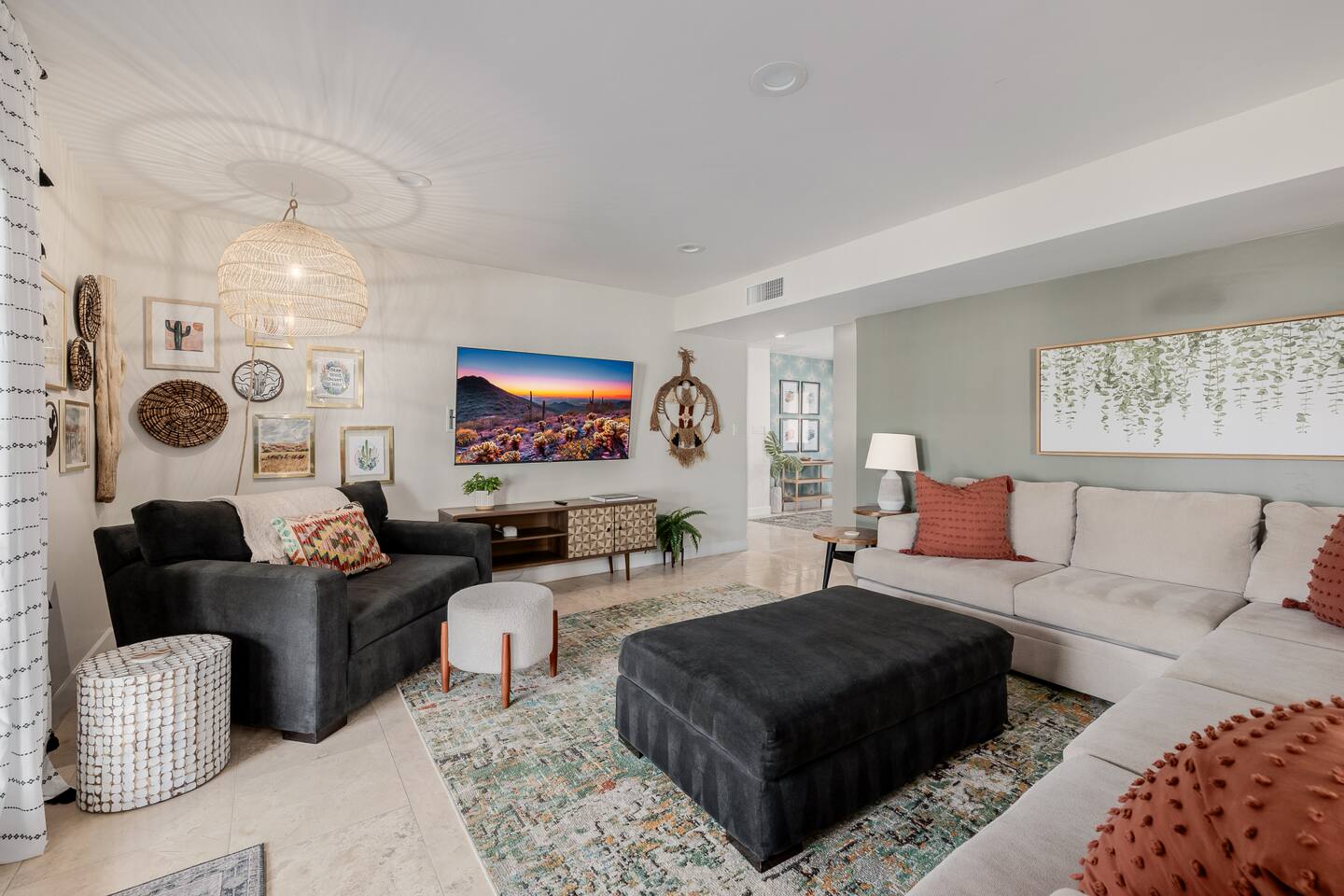 Escape to Sonoran Soul, a luxury North Scottsdale retreat just 5 minutes from Kierland Commons and Scottsdale Quarter. Perfect for families, groups, golf trips, and bachelorette getaways, this 4-bed, 2-bath home sleeps up to 12 and delivers the full resort experience—8' deep private heated pool, hot tub, putting green, fire pit, outdoor kitchen, Smart TVs everywhere, and a garage game room loaded with air hockey, arcade games, darts, and more. Inside, unwind in stylish living spaces, a fully stocked chef’s kitchen, and comfortable bedrooms with blackout shades and bamboo linens. Fast Wi-Fi, multiple workspaces, and top-tier Mostess hosting round out a stay built for effortless fun in one of Scottsdale’s most desirable neighborhoods. Outdoor Oasis: - Private 8' deep pool (heating available) - Hot tub for relaxing evenings - 3-hole putting green and cornhole boards - Outdoor kitchen with grill and bar seating - Fire pit with cozy seating area - Covered patio with dining for 8 and outdoor Smart TV Bedrooms: - Primary: King bed with ensuite bathroom - Bedroom 2: Queen bed - Bedroom 3: Two twin bunk beds - Bedroom 4: Two queen beds - Bamboo sheets, fans, blackout shades/curtains Bathrooms: - 2 full baths, one stand up shower (primary), one shower/tub combo - Shampoo, conditioner, body/hand soap - Fluffy towels and hair dryers provided Indoor Comforts: - Stocked chef's kitchen with modern appliances - Spacious living areas with Smart TVs - Garage game room featuring air hockey, arcade games, and more - High-speed Wi-Fi and dedicated workspace - Washer and dryer with provided essentials - Nespresso, Keurig, drip, coffee press, tea bar - Fully stocked kitchen: InstantPot, blender Dining: - Dining table that seats 6 - Bar stools at counter seat 4 - Outdoor dining seats 6 Entertainment: - 5 Smart TVs: both living rooms, primary bedroom, bunk room, outside - Log in to any app of your choice with your own login - High speed WIFI - Our dining table is a great place to get work done - Pac-Man arcade game Pool + Hot Tub - Private pool can be heated Oct 1 - April 30, additional daily fee - Pool Heat: $65/night or $400/week, Oct–Apr - Hot Tub always included - Pool pump for floats provided - 8 pool side lounge chairs, plus umbrellas - Pool towels provided Backyard: - Outdoor kitchen with grill, SmartTV, sink, fridge, bar seating - Fire pit + conversation seating area - Covered patio with dining table, seating for 10 - Covered Outdoor Smart TV Lounge - Yard games Garage Game Room - Air hockey - Pop-a-shot basketball hoop - Pacman Arcade game - Street Fighter II arcade game - Darts - Sofa with coffee table - TV Laundry - Washer and dryer in home - Laundry detergent, stain treatment and dryer sheets provided - Iron, ironing board, and steamer provided Parking: - Up to 4 vehicles - Parking Options: driveway, garage or on-street Mostess Hosts Professionally hosted by Mostess, a boutique Arizona vacation rental brand known for elevated experiences and top-tier communication — without the dreaded checkout chore list. Designed by influencer @hautehouselove!