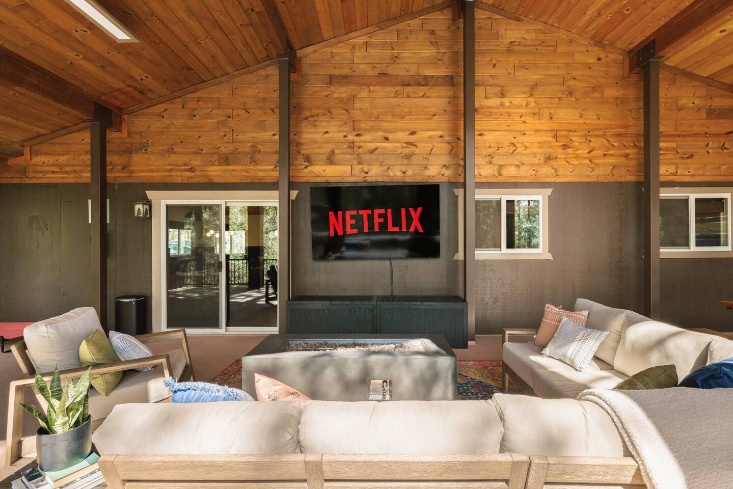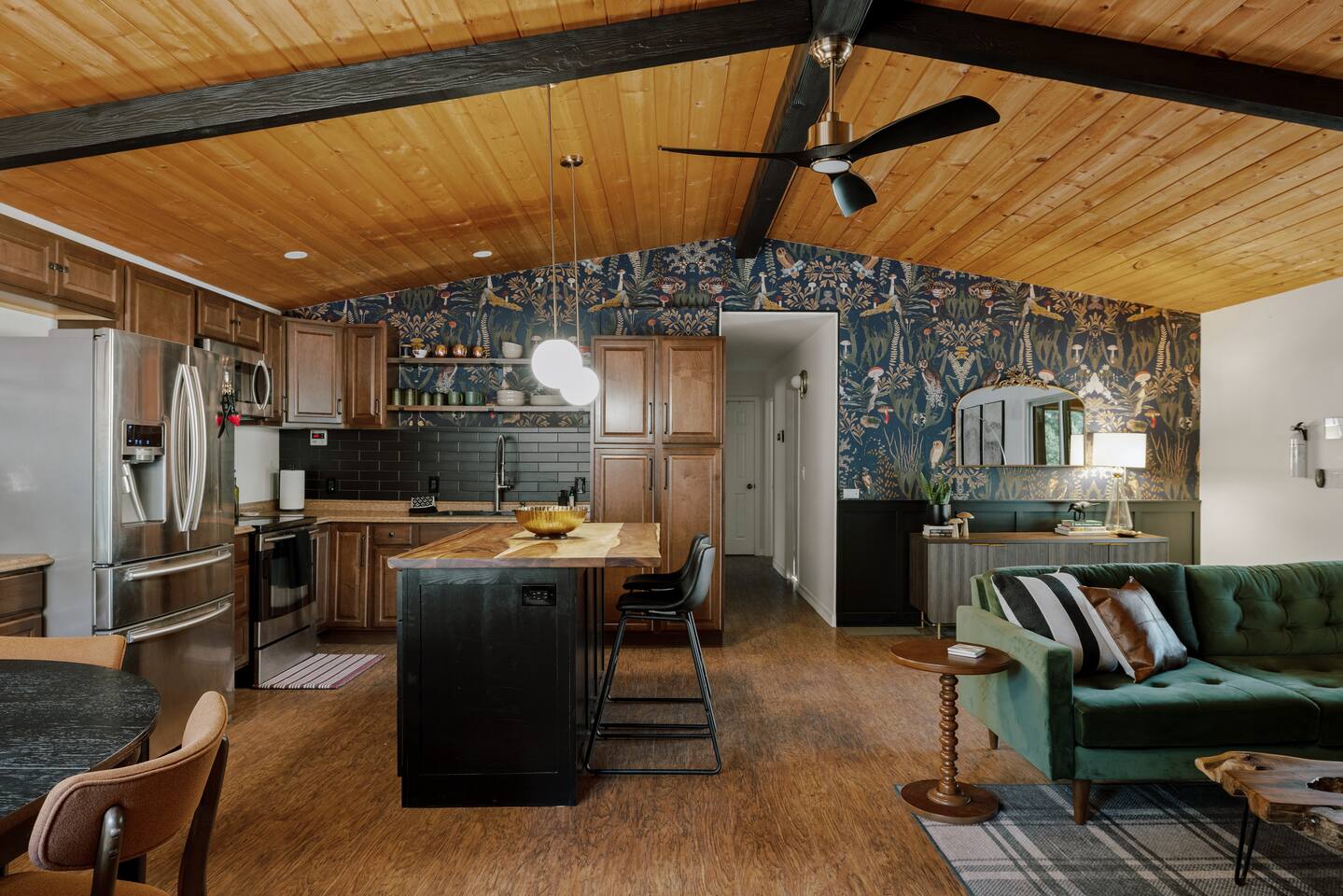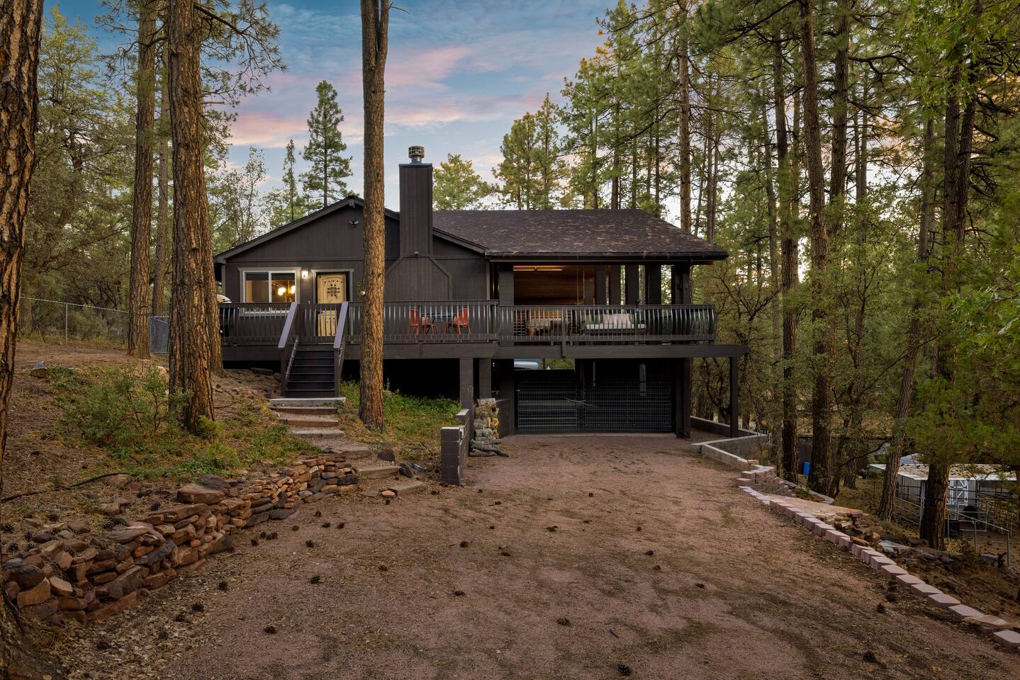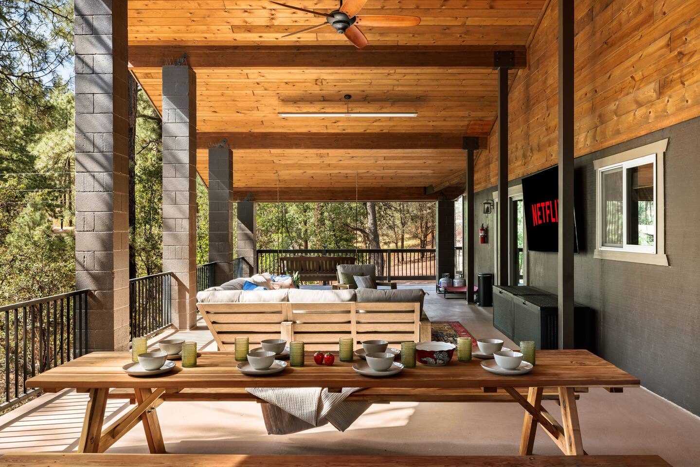 MASSIVE wraparound deck in the Forest! - Hot tub + Fire Pit for cozy nights - EV Charger, 85" Smart TV on deck - Grill + outdoor dining under the pines - Electric fireplace in living room. - Dog friendly with a fenced in dog run Forest getaway for families, couples, or friends to relax, recharge & explore! *Arriving early or leaving late? Ask us about a half day add-on.